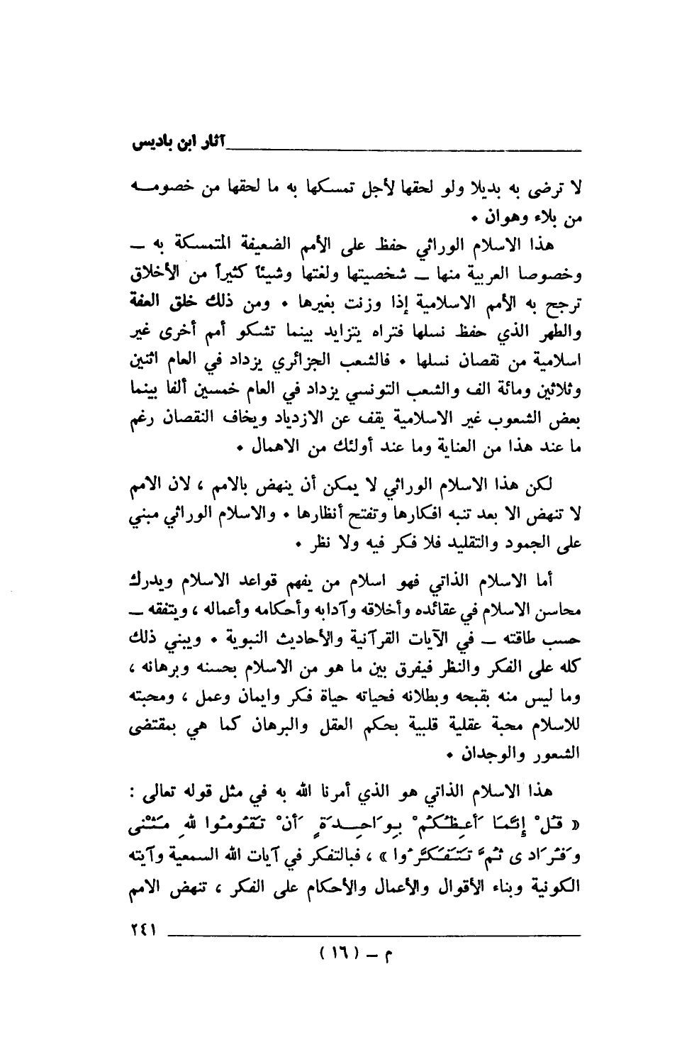 هذا الإسلام الوراثي حفظ على الأمم الضعيفة المتمسكة به- وخصوصا العربية منها- شخصيتها ولغتها وشيئا كثيراً من الأخلاق ترجع به الأمم الإسلامية إذا وزنت بغيرها. ومن ذلك خلق العفة والطهر الذي حفظ نسلها فتراه يتزايد بينما تشكو أمم أخرى غير إسلامية من نقصان نسلها. فالشعب الجزائري يزداد في العام اثنين وثلاثين ومائة ألف والشعب التونسي يزداد في العام خمسين ألفا بينما بعض الشعوب غير الإسلامية يقف عن الازدياد ويخاف النقصان رغم ما عند هذا من العناية وما عند أولئك من الإهمال.