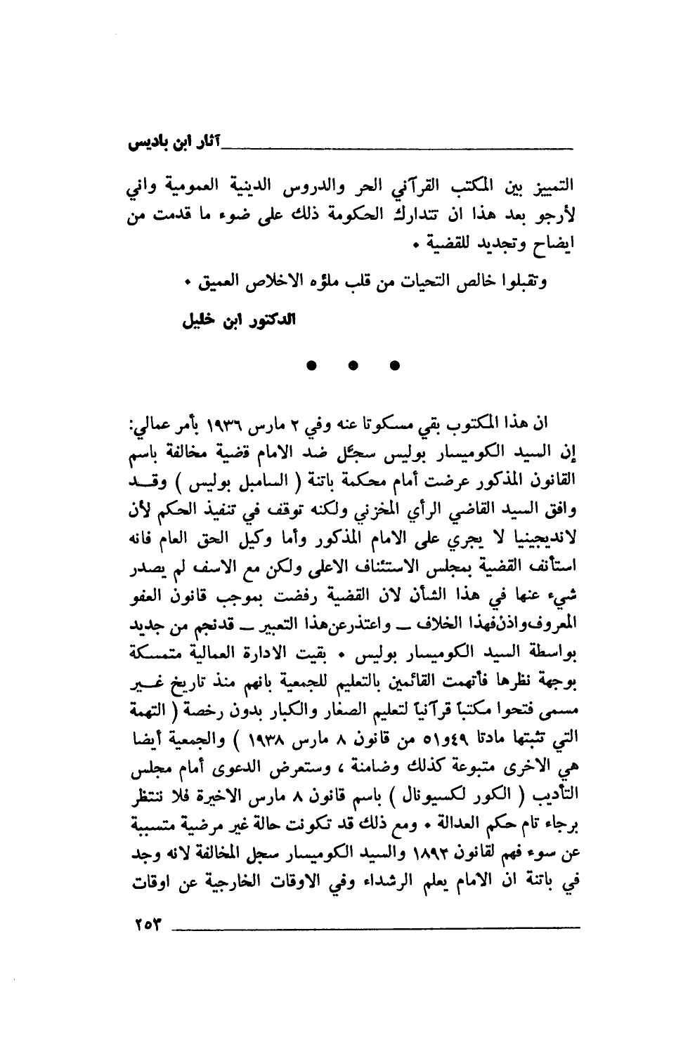 إن السيد الكوميسار بوليس سجَّل ضد الإمام قضية مخالفة باسم القانون المذكور عرضت أمام محكمة باتنة (السامبل بوليس) وقد وافق السيد القاضي الرأي المخزني ولكنه توقف في تنفيذ الحكم لأن لانديجينيا لا يجري على الإمام المذكور وأما وكيل الحق العام فإنه استأنف القضية بمجلس الاستئناف الأعلى ولكن مع الأسف لم يصدر شيء عنها في هذا الشأن لأن القضية رفضت بموجب قانون العفو المعروف وإذن فهذا الخلاف- واعتذر عن هذا التعبير- قد نجم من جديد بواسطة السيد الكوميسار بوليس. بقيت الإداوة العمالية متمسكة بوجهة نظرها فاتهمت القائمين بالتعليم للجمعية بأنهم منذ تاريخ غير مسمى فتحوا مكتبا قرآنيا لتعليم الصغار والكبار بدون رخصة (التهمة التي تثبتها مادتا 49 و51 من قانون 8 مارس 1938) والجمعية أيضا هي الأخرى متبوعة كذلك وضامنة، وستعرض الدعوى أمام مجلس التأديب (الكور لكسيونال) باسم قانون 8 مارس الأخيرة فلا ننتظر برجاء تام ص حكم العدالة. ومع ذلك قد تكونت حالة غير مرضية متسببة عن سوء فهم لقانون 1893 والسيد الكوميسار سجل المخالفة لأنه وجد في باتنة أن الإمام يعلم الرشداء وفي الأوقات الخارجية عن أوقات