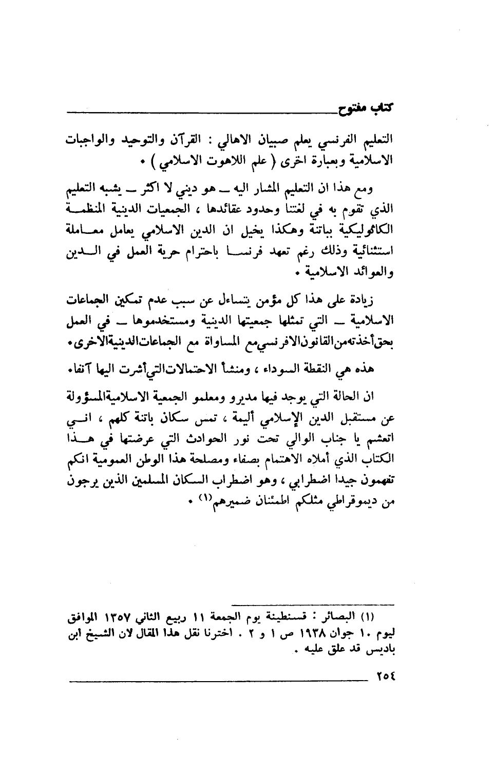 (1) البصائر: قسنطينة يوم الجمعة 11 ربيع الثانى 1357 الموافق ليوم 10 جوان 1938 ص 1و02 اخترنا نقل هذا المقال لأن الشيخ ابن باديس قد علق عليه.