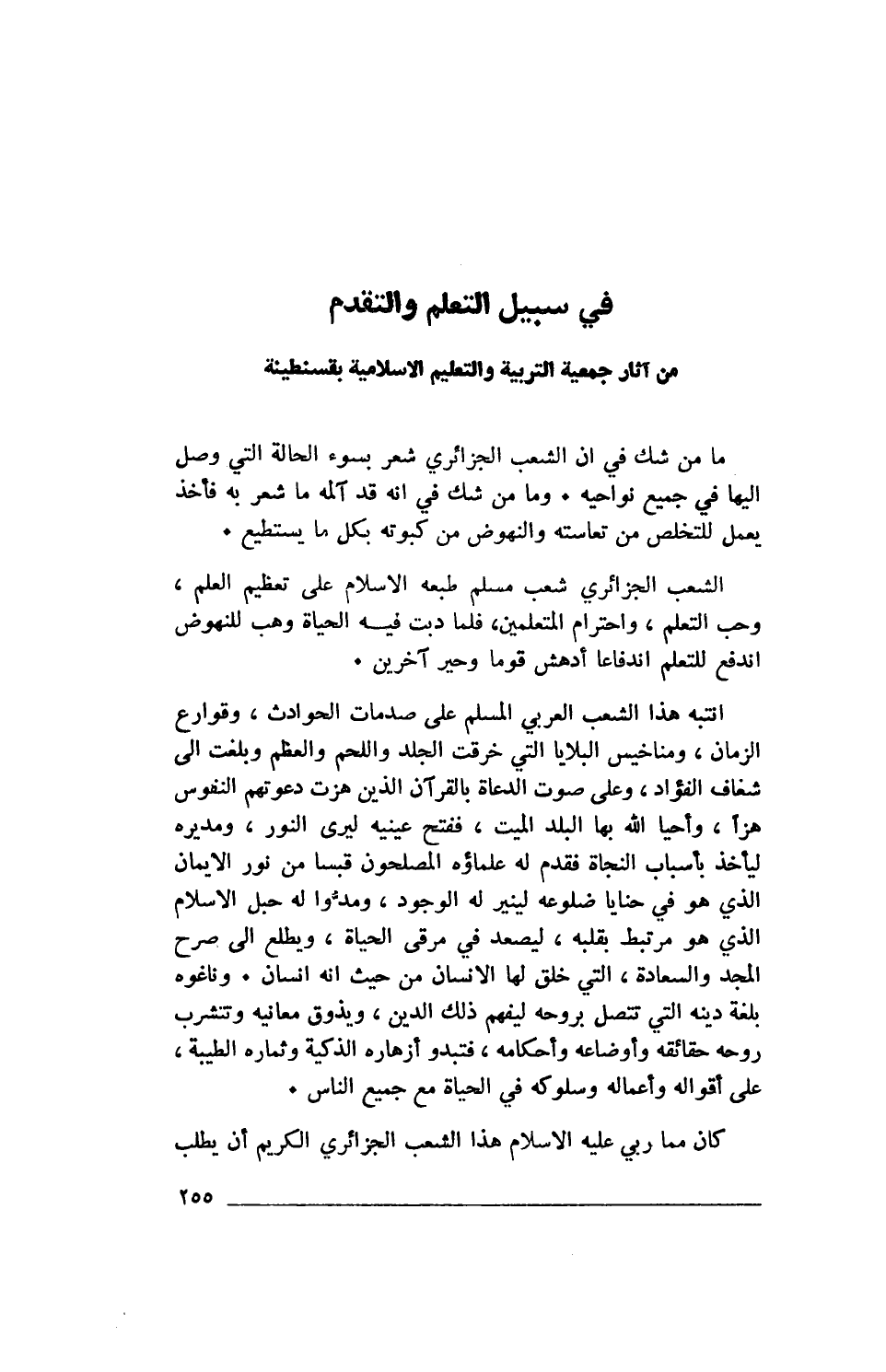 الشعب الجزائري شعب مسلم طبعه الإسلام على تعظيم العلم، وحب التعلم، واحترام المتعلمين، فلما دبت فيه الحياة وهب للنهوض اندفع للتعلم اندفاعا أدهش قوما وحير آخرين.