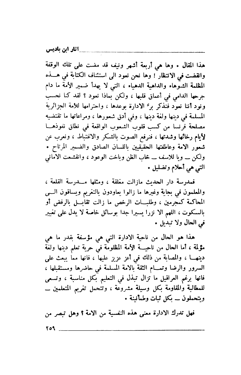 هذا المقال. وها هي أربعة أشهر ونيف قد مضت على تلك الوقفة وانقضت في الانتظار! وها نحن نعود إلى استئناف الكتابة في هذه المظلمة الشوهاء والداهية الدهياء، التي لا يهدأ ضمير الأمة ما دام جرحها الدامي في أعماق قلبها، ولكن بماذا نعود؟ لقد كنا نحسب ونود أننا نعود فنذكر برَّ الإدارة بوعدها، واحترامها للأمة الجزائرية المسلمة في دينها ولغة دينها، وفي أدق شعورها، ومراعاتها ما تقتضيه مصلحة فرنسا من كسب قلوب الشعوب الواقعة في نطاق نفوذها لأيام رخائها وشدتها، فنرفع الصوت بالشكر والاغتباط، ونعرب عن شعور الأمة وعاطقتها الحقيقيين باللسان الصادق والضمير المرتاح. ولكن- ويا للأسف- خاب الظن وباخت الوعود، وانقشعت الأماني التي هي أحلام وتضليل.