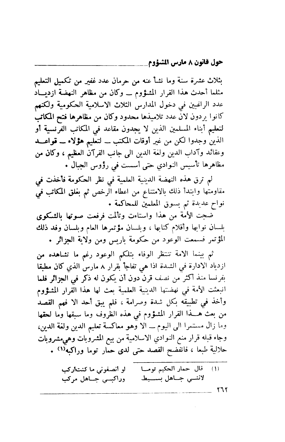 ثم بينما الأمة تنتظر الوفاء بتلكم الوعود رغم ما تشاهده من ازدياد الإدارة في الشدة إذا هي تفاجأ بقرار 8 مارس الذي كان مطبقا بفرنسا منذ أكثر من نصف قرن دون أن يكون له ذكر في الجزائر فلما انبعثت الأمة في نهضتها الدينية العلمية بعث لها هذا القرار المشؤوم وأخذ في تطبيقه بكل شدة وصرامة، فلم يبق أحد إلا فهم القصد من بعث هذا القرار المشؤوم في هذه الظروف وما سبقها وما لحقها وما زال مستمرا إلى اليوم- إلا وهو معاكسة تعليم الدين ولغة الدين، وجاء قبله قرار منع النوادي الإسلامية من بيع المشروبات وهي مشروبات حلالية طبعا، فانفضح القصد حتى لدى حمار توما وراكبه (1).