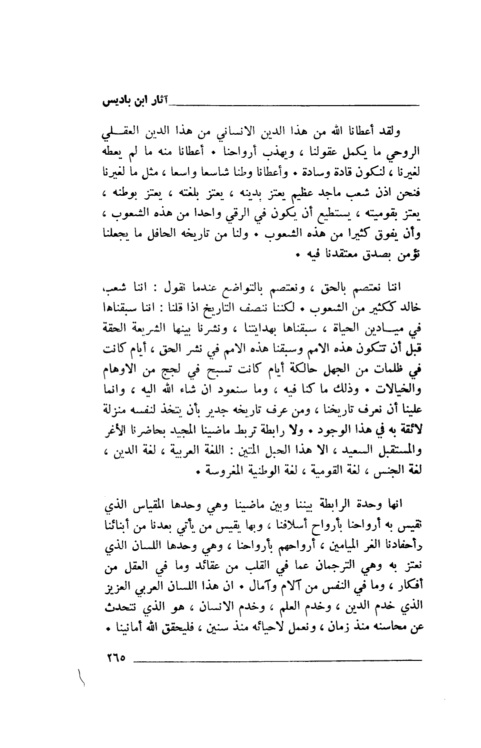 إننا نعتصم بالحق، ونعتصم بالتواضع عندما نقول: إننا شعب خالد ككثير من الشعوب. لكننا ننصف التاريخ إذا قلنا: إننا سبقناها في ميادين الحياة، سبقناها بهدايتنا، ونشرنا بينها الشريعة الحقة قبل أن تتكون هذه الأمم وسبقنا هذه الأمم في نشر الحق، أيام كانت في ظلمات من الجهل حالكة أيام كانت تسبح في لجج من الأوهام والخيالات. وذلك ما كنا فيه، وما سنعود إن شاء الله إليه، وإنما علينا أن نعرف تاريخنا، ومن عرف تاريخه جدير بأن يتخذ لنفسه منزلة لائقة به في هذا الوجود. ولا رابطة تربط ماضينا المجيد بحاضرنا الأغر والمستقبل السعيد، إلا هذا الحبل المتين: اللغة العربية، لغة الدين، لغة الجنس، لغة القومية، لغة الوطنية المغروسة.