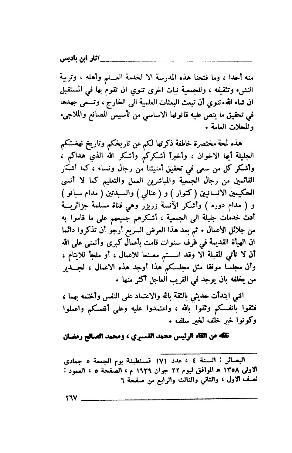 منه أحدا، وما فتحنا هذه المدرسة إلا لخدمة العلم وأهله، وتربية النشء وتثقيفه، وللجمعية نيات أخرى تنوي أن تقوم بها في المستقبل إن شاء الله. تنوي أن تبعث البعثات العلمية إلى الخارج، وتسعى جهدها في تحقيق ما ينص عليه قانونها الأساسي من تأسيس المصانع والملاجىء والمحلات العامة.