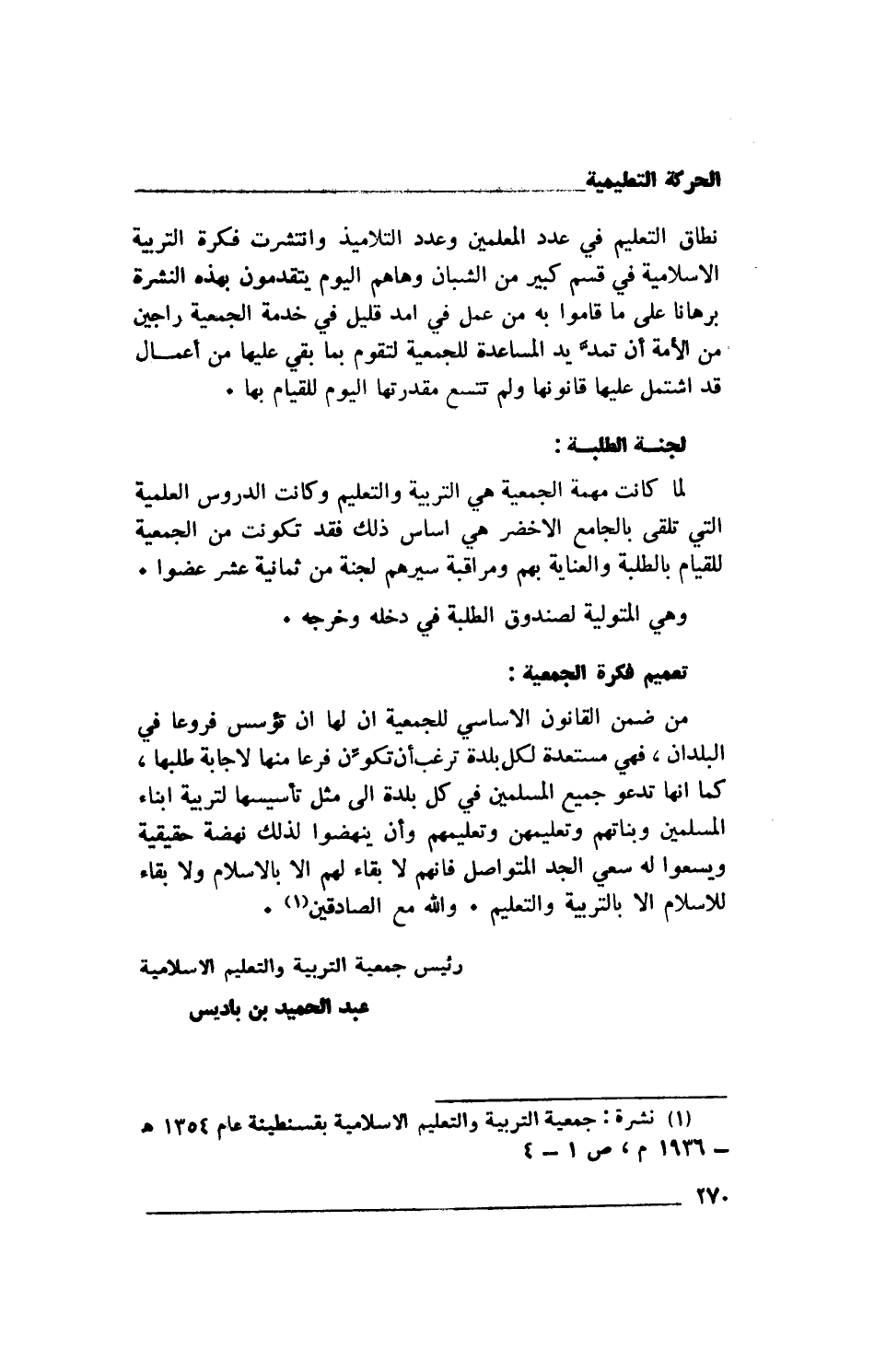 (1) نشرة جمعية التربية والتعليم الإسلامية بقسنطينة عام 1354هـ -1936م، ص 1 - 4.