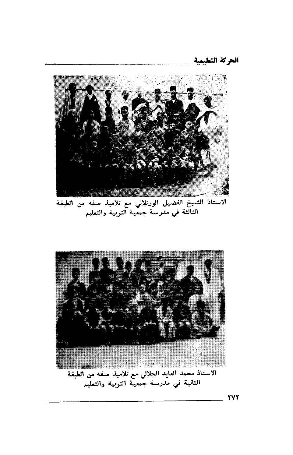 [صورة: الأستاذ الشيخ الفضيل الورتلاني مع تلاميذ صفه من الطبقة الثالثة في مدرسة جمعية التربية والتعليم]