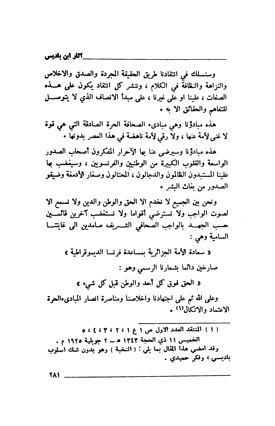 وقد أمضى هذا المقال بما يلى (النخبة) وهو بدون شك أسلوب باديسي، وفكر حميدي.