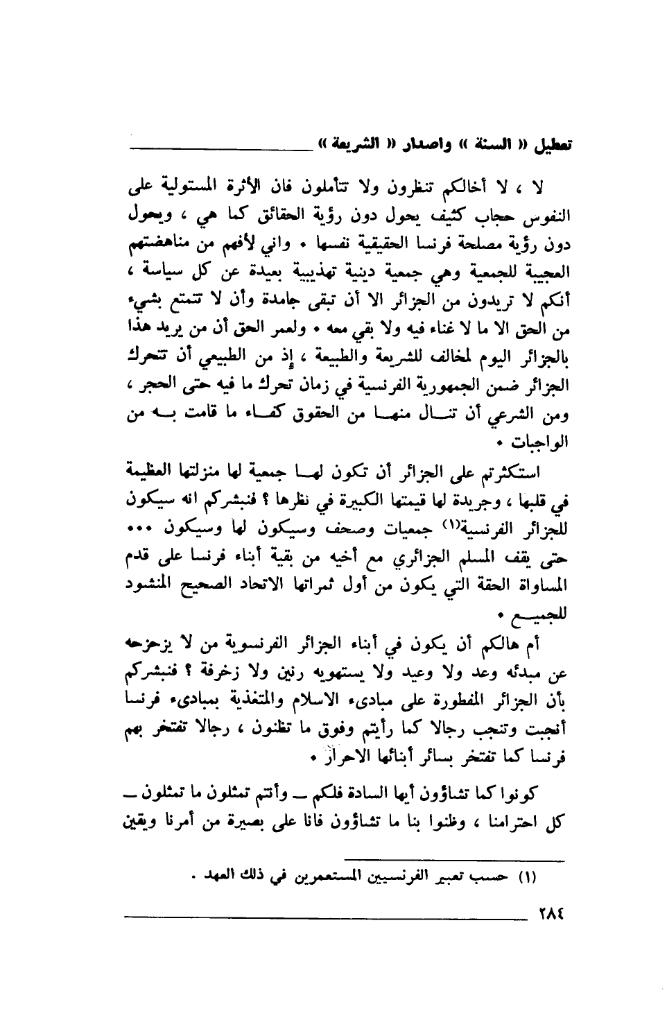لا، لا أخالكم تنظرون ولا تتأملون فإن الأثرة المستولية على النفوس حجاب كثيف يحول دون رؤية الحقائق كما هي، ويحول دون رؤية مصلحة فرنسا الحقيقية نفسها. وإني لأفهم من مناهضتهم العجيبة للجمعية وهي جمعية دينية تهذيبية بعيدة عن كل سياسة، أنكم لا تريدون من الجزائر إلا أن تبقى جامدة وأن لا تتمتع بشيء من الحق إلا ما لا غناء فيه ولا بقي معه. ولعمر الحق أن من يريد هذا بالجزائر اليوم لمخالف للشريعة والطبيعة، إذ من الطبيعي أن تتحرك الجزائر ضمن الجمهورية الفرنسية في زمان تحرك ما فيه حتى الحجر، ومن الشرعي أن تنال منها من الحقوق كفاء ما قامت به من الواجبات.