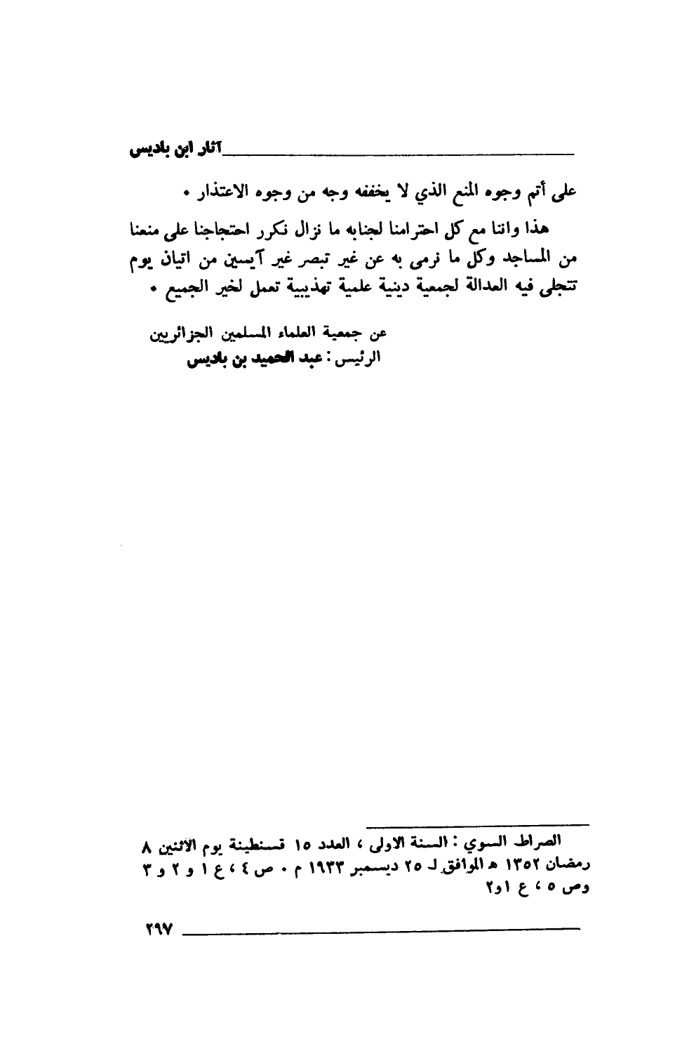 الصراط السوي: السنة الأولى، العدد 15 قسنطينة يوم الإثنين 8 رمضان 1352هـ الموافق لـ 25 ديسمبر 1933م. ص 4، ع 1 و 2 و 3 وص 5، ع 1 و 2.