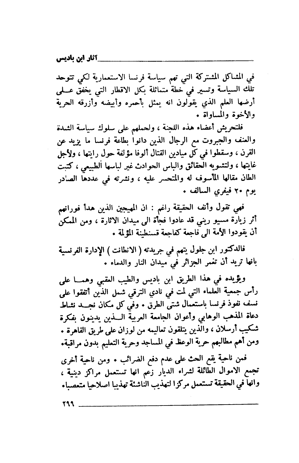 ويؤيده في هذا الطريق ابن باديس والطيب العقبي وهما على رأس جمعية العلماء التي لمت في نادي الترقي شمل الذين اتفقوا على نسف نفوذ فرنسا باستعمال شتى الطرق. وفي كل مكان نجد نشاط دعاة المذهب الوهابي وأعوان الجامعة العربية الذين يدينون بفكرة شكيب أرسلان، والذين يتلقون تعاليمه من لوزان على طريق القاهرة. ومن أهم مطالبهم حرية الوعظ في المساجد وحرية التعليم بدون مراقبة.