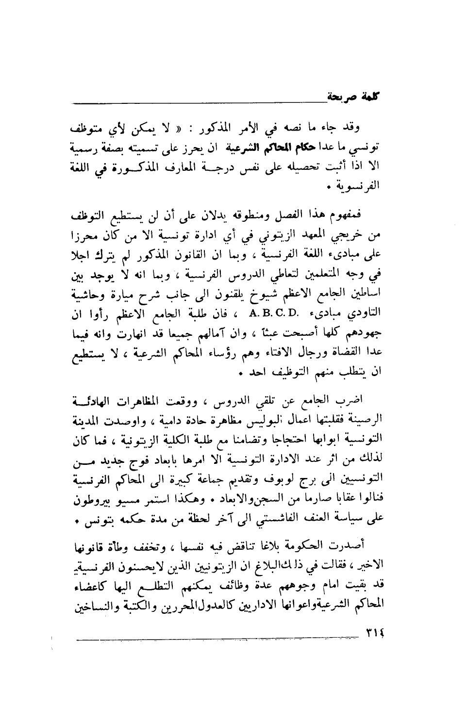 فمفهوم هذا الفصل ومنطوقه يدلان على أن لن يستطيع التوظف من خريجي المعهد الزيتوني في أي إدارة تونسية إلا من كان محرزا على مبادئ اللغة الفرنسية، وبما أن القانون المذكور لم يترك أجلا في وجه المتعلمين لتعاطي الدروس الفرنسية، وبما أنه لا يوجد بين أساطين الجامع الأعظم شيوخ يلقنون إلى جانب شرح ميارة وحاشية التاودي مبادئ A. B. C. D.، فإن طلبة الجامع الأعظم رأوا أن جهودهم كلها أصبحت عبثاً، وأن آمالهم جميعا قد انهارت وأنه فيما عدا القضاة ورجال الإفتاء وهم رؤساء المحاكم الشرعية، لا يستطيع أن يتطلب منهم التوظيف أحد.