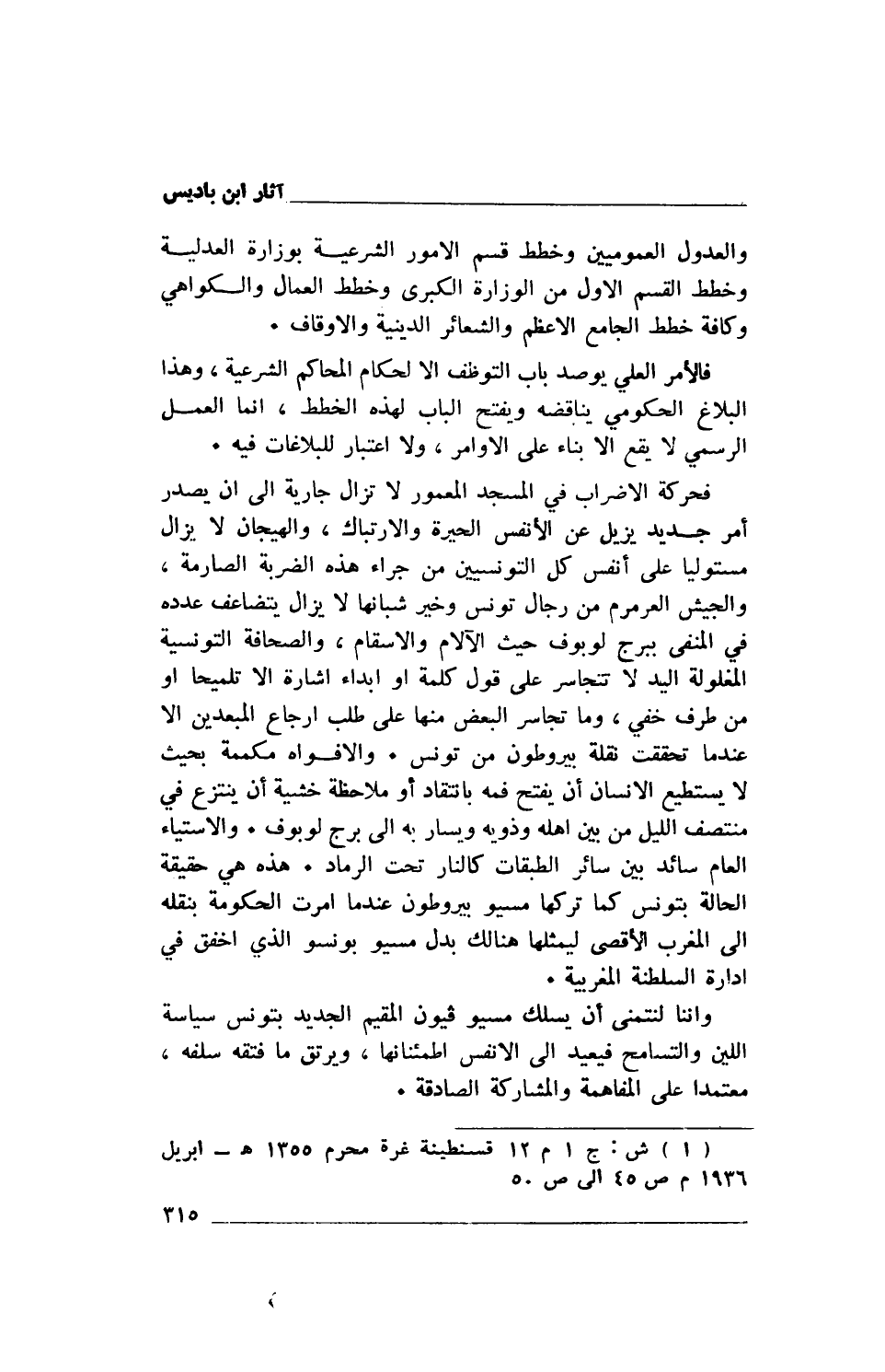 فحركة الإضراب في المسجد المعمور لا تزال جارية إلى أن يصدر أمر جديد يزبل عن الأنفس الحيرة والارتباك، والهيجان لا يزال مستوليا على أنفس كل التونسيين من جراء هذه الضربة الصارمة، والجيش العرمرم من رجال تونس وخير شبانها لا يزال يتضاعف عدده في المنفى ببرج لوبوف حيث الآلام والأسقام، والصحافة التونسية المغلولة اليد لا تتجاسر على قول كلمة أو إبداء إشارة إلا تلميحا أو من طرف خفي، وما تجاسر البعض منها على طلب إرجاع المبعدين إلا عندما تحققت نقلة بيروطون من تونس. والأفواه مكممة بحيث لا يستطيع الإنسان أن يفتح فمه بانتقاد أو ملاحظة خشية أن ينتزع في منتصف الليل من بين أهله وذويه ويسار به إلى برج لوبوف. والاستياء العام سائد بين سائر الطبقات كالنار تحت الرماد. هذه هي حقيقة الحالة بتونس كما تركها مسيو بيروطون عندما أمرت الحكومة بنقله إلى المغرب الأقصى ليمثلها هنالك بدل مسيو بونسو الذي أخفق في إدارة السلطنة المغربية.