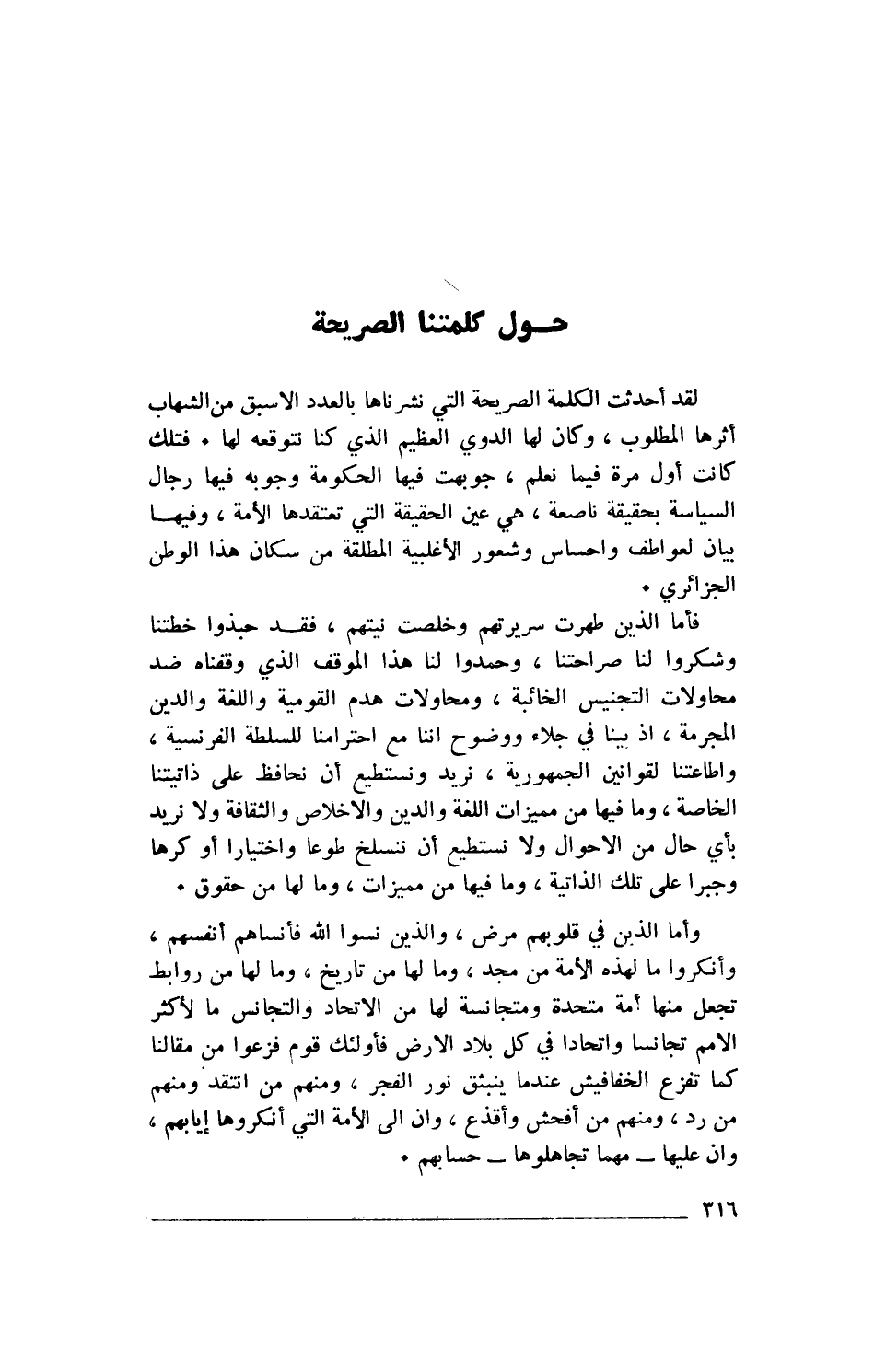 لقد أحدثت الكلمة الصريحة التي نشرناها بالعدد الاسبق من الشهاب أثرها المطلوب، وكان لها الدوي العظيم الذي كنا نتوقعه لها. فتلك كانت أول مرة فيما نعلم، جوبهت فيها الحكومة وجوبه فيها رجال السياسة بحقيقة ناصحة، هي عين الحقيقة التي تعتقدها الأمة، وفيها بيان لعواطف وإحساس وشعور الأغلبية المطلقة من سكان هذا الوطن الجزائري.