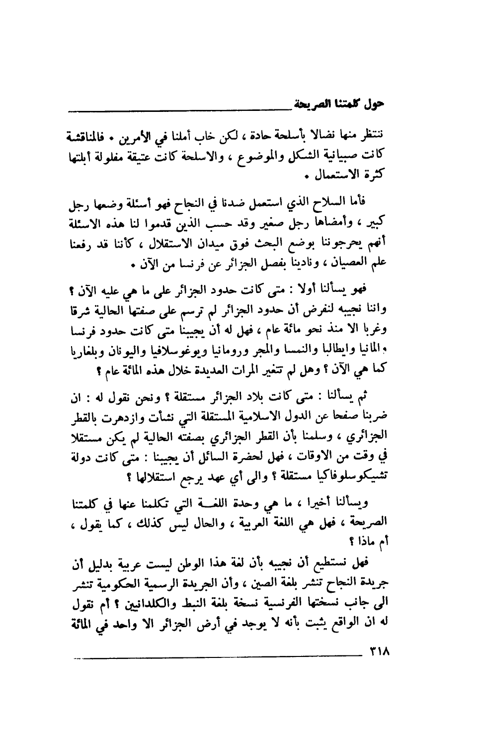 فأما السلاح الذي استعمل ضدنا في النجاح فهو أسئلة وضعها رجل كبير، وأمضاها رجل صغير وقد حسب الذين قدموا لنا هذه الأسئلة أنهم يحرجوننا بوضع البحث فوق ميدان الاستقلال، كأننا قد رفعنا علم العصيان، ونادينا بفصل الجزائر عن فرنسا من الآن.