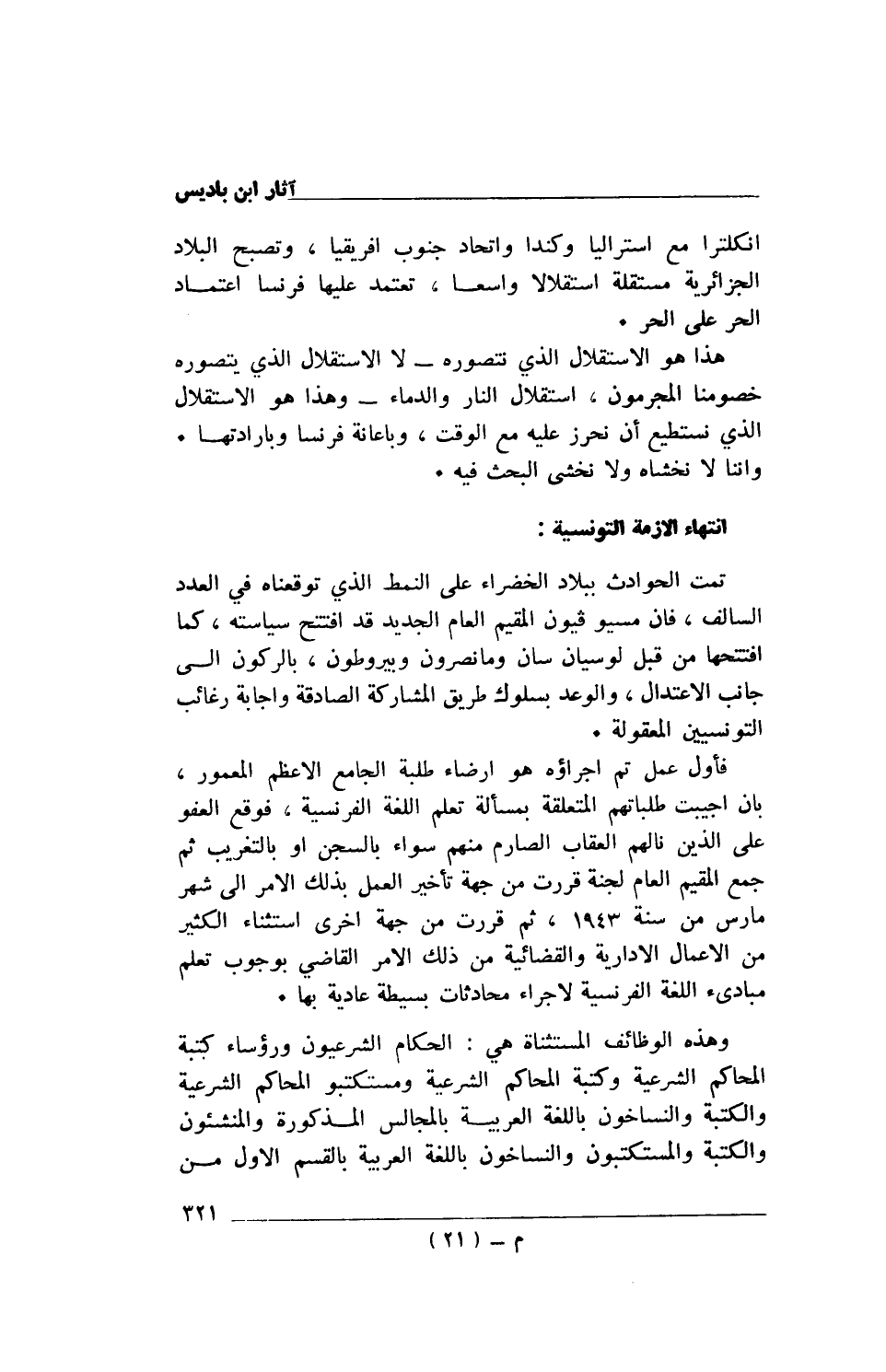 هذا هو الاستقلال الذي نتصوره- لا الاستقلال الذي يتصوره خصومنا المجرمون، إستقلال النار والدماء- وهذا هو الاستقلال الذي نستطيع أن نحرز عليه مع الوقت، وبإعانة فرنسا وبإرادتها. وإننا لا نخشاه ولا نخشى البحث فيه.