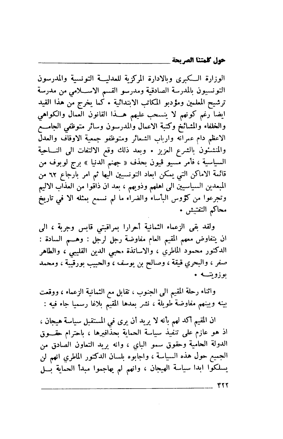 الوزارة الكبرى وبالإدارة المركزية للعدلية التونسية والمدرسون التونسيون بالمدرسة الصادقية ومدرسو القسم الإسلامي من مدرسة ترشيح المعلمين ومؤدبو المكاتب الابتدائية. كما يخرج من هذا القيد أيضا رغم كونهم لا ينسحب عليهم هذا القانون العمال والكواهي والخلفاء والمشائخ وكتبة الأعمال والمدرسون وسائر متوظفي الجامع الأعظم دام عمرانه وأرباب الشعائر ومتوظفو جمعية الأوقاف والعدل والمنشؤون بالشرع العزيز. وبعد ذلك وقع الالتفات إلى الناحية السياسية، فأمر مسيو فيون بحذف "جهنم الدنيا" برج لوبوف من قائمة الأماكن التي يمكن إبعاد التونسيين إليها ثم أمر بإرجاع 62 من المبعدين السياسيين إلى أهلهم وذويهم، بعد أن ذاقوا من العذاب الأليم وتجرعوا من كؤوس البأساء والضراء ما لم نسمع بمثله إلا في تاريخ محاكم التفتيش.