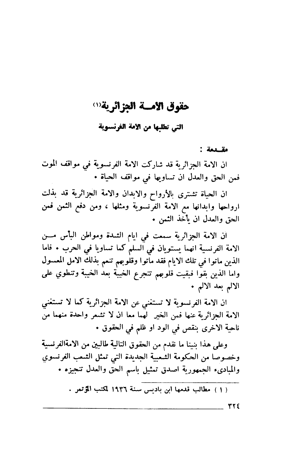 (1) مطالب قدمها ابن باديس سنة 1936 لمكتب المؤتمر.