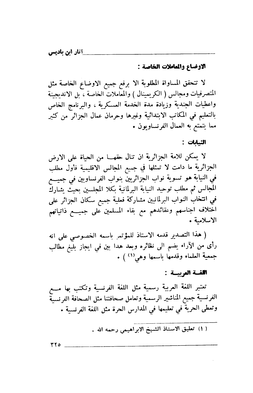 (هذا التصدير قدمه الأستاذ للمؤتمر باسمه الخصوصي على أنه رأى من الآراء يضم إلى نظائره وبعد هذا بين في إيجاز بليغ مطالب جمعية العلماء وقدمها باسمها وهي (1)).