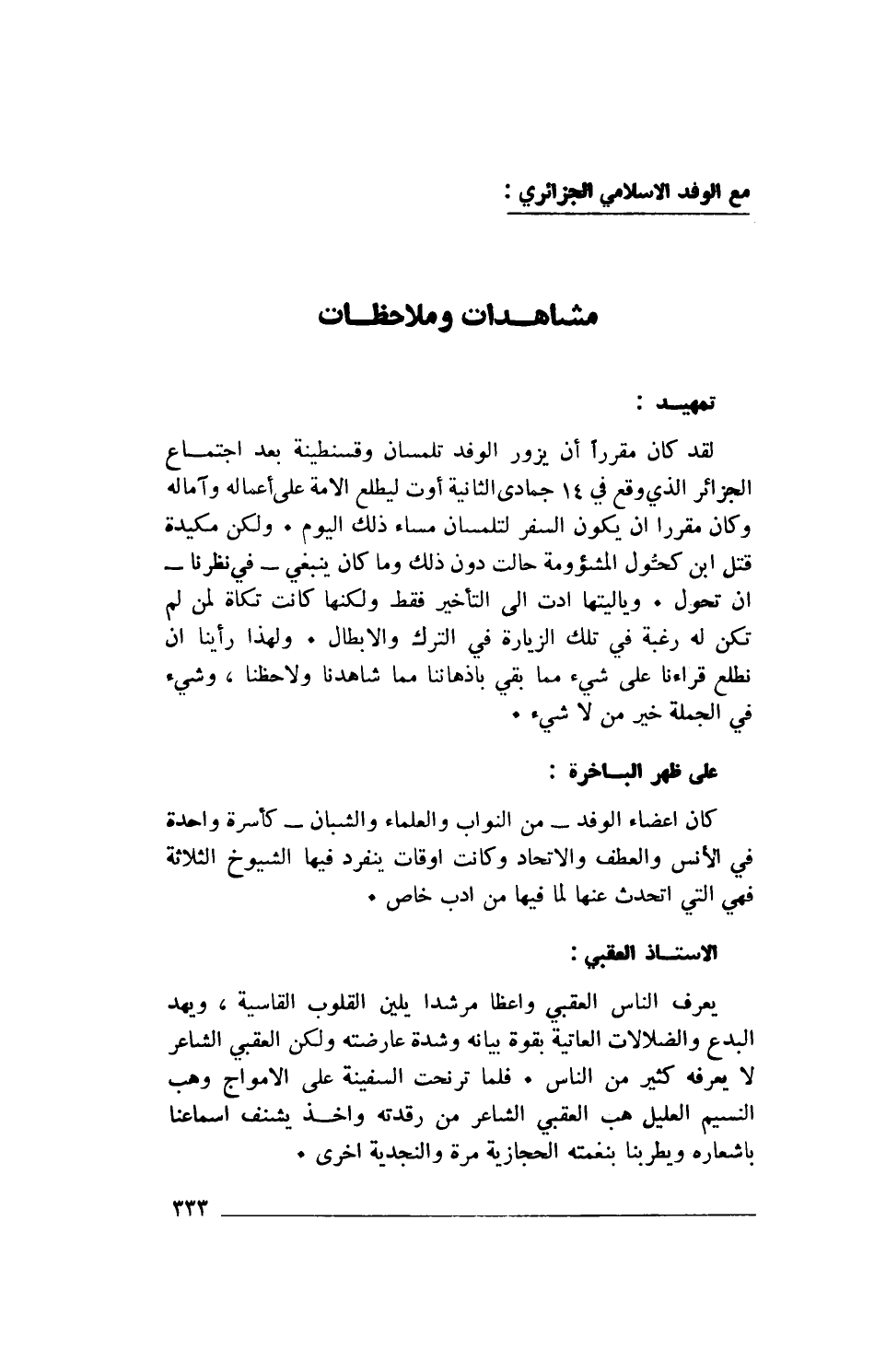 كان أعضاء الوفد- من النواب والعلماء والشبان- كأسرة واحدة في الأنس والعطف والاتحاد وكانت أوقات ينفرد فيها الشيوخ الثلاثة فهي التي أتحدث عنها لما فيها من أدب خاص.