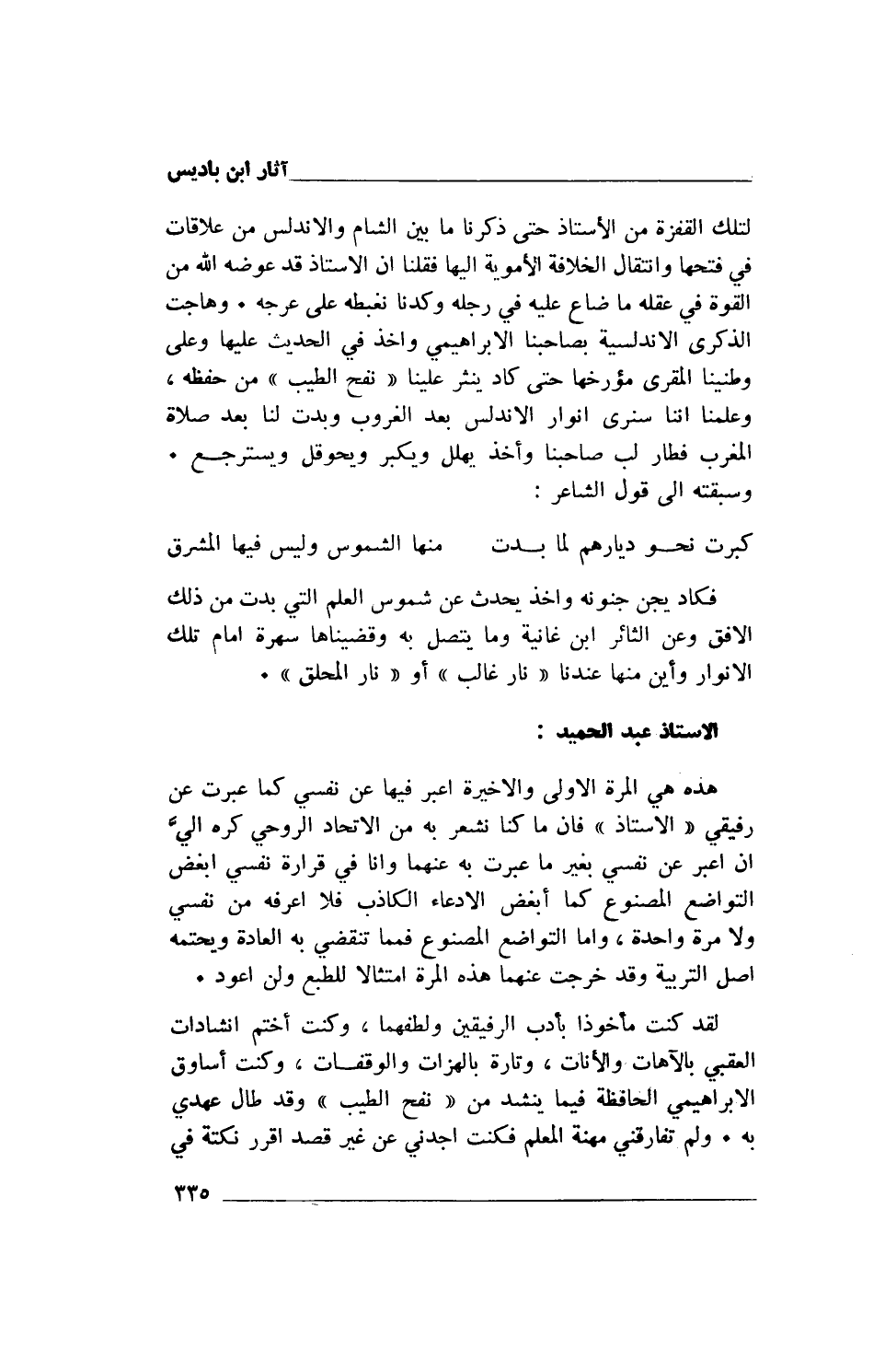 لقد كنت مأخوذا بأدب الرفيقين ولطفها، وكنت أختم إنشادات العقبي بالآهات والأنات، وتارة بالهزات والوقفات، وكنت أساوق الإبراهيمي الحافظة فيما ينشد من "نفح الطيب" وقد طال عهدي به. ولم تفارقني مهنة المعلم فكنت أجدني عن غير قصد أقرر نكتة في