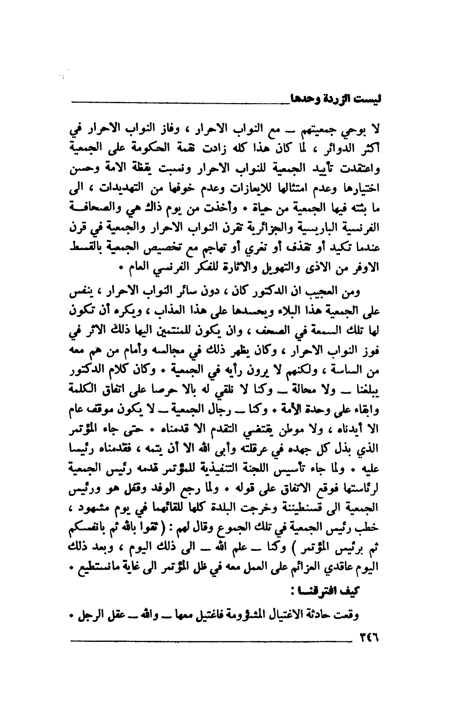 ومن العجيب أن الدكتور كان، دون سائر النواب الأحرار، ينفس على الجمعية هذا البلاء ويحسدها على هذا العذاب، ويكره أن تكون لها تلك السمعة في الصحف، وأن يكون للمنتمين إليها ذلك الأثر في فوز النواب الأحرار، وكان يظهر ذلك في مجالسه وأمام من هم معه من الساسة، ولكنهم لا يرون رأيه في الجمعية. وكان كلام الدكتور يبلغنا- ولا محالة- وكنا لا نلقي له بالا حرصا على اتفاق الكلمة وإبقاء على وحدة الأمة. وكنا- رجال الجمعية- لا يكون موقف عام إلا أيدناه، ولا موطن يقتضي التقدم إلا قدمناه. حتى جاء المؤتمر الذي بذل كل جهده في عرقلته وأبى الله إلا أن يتمه، فقدمناه رئيسا عليه. ولما جاء تأسيس اللجنة التنفيذية للمؤتمر قدمه رئيس الجمعية لرئاستها فوقع الإتّفاق على قوله. ولما رجع الوفد وقفل هو ورئيس الجمعية إلى قسنطينة وخرجت البلدة كلها للقائهما في يوم مشهود، خطب رئيس الجمعية في تلك الجموع وقال لهم: (ثقوا بالله ثم بأنفسكم ثم برئيس المؤتمر) وكنا- علم الله- إلى ذلك اليوم، وبعد ذلك اليوم عاقدي العزائم على العمل معه في ظل المؤتمر إلى غاية ما نستطيع.