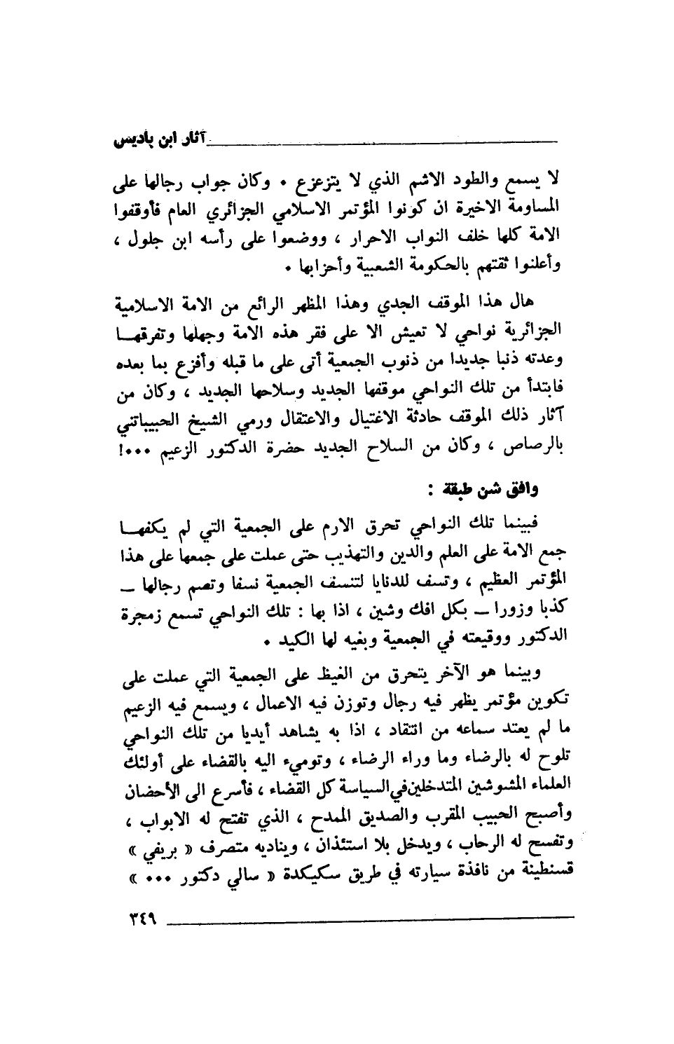 هال هذا الموقف الجدي وهذا المظهر الرائع من الأمة الإسلامية الجزائرية نواحي لا تعيش إلا على فقر هذه الأمة وجهلها وتفرقها وعدته ذنبا جديدا من ذنوب الجمعية أتى على ما قبله وأفزع بما بعده فابتدأ من تلك النواحي موقفها الجديد وسلاحها الجديد، وكان من آثار ذلك الموقف حادثة الاغتيال والاعتقال ورمي الشيخ الحبيباتني بالرصاص، وكان من السلاح الجديد حضرة الدكتور الزعيم …!