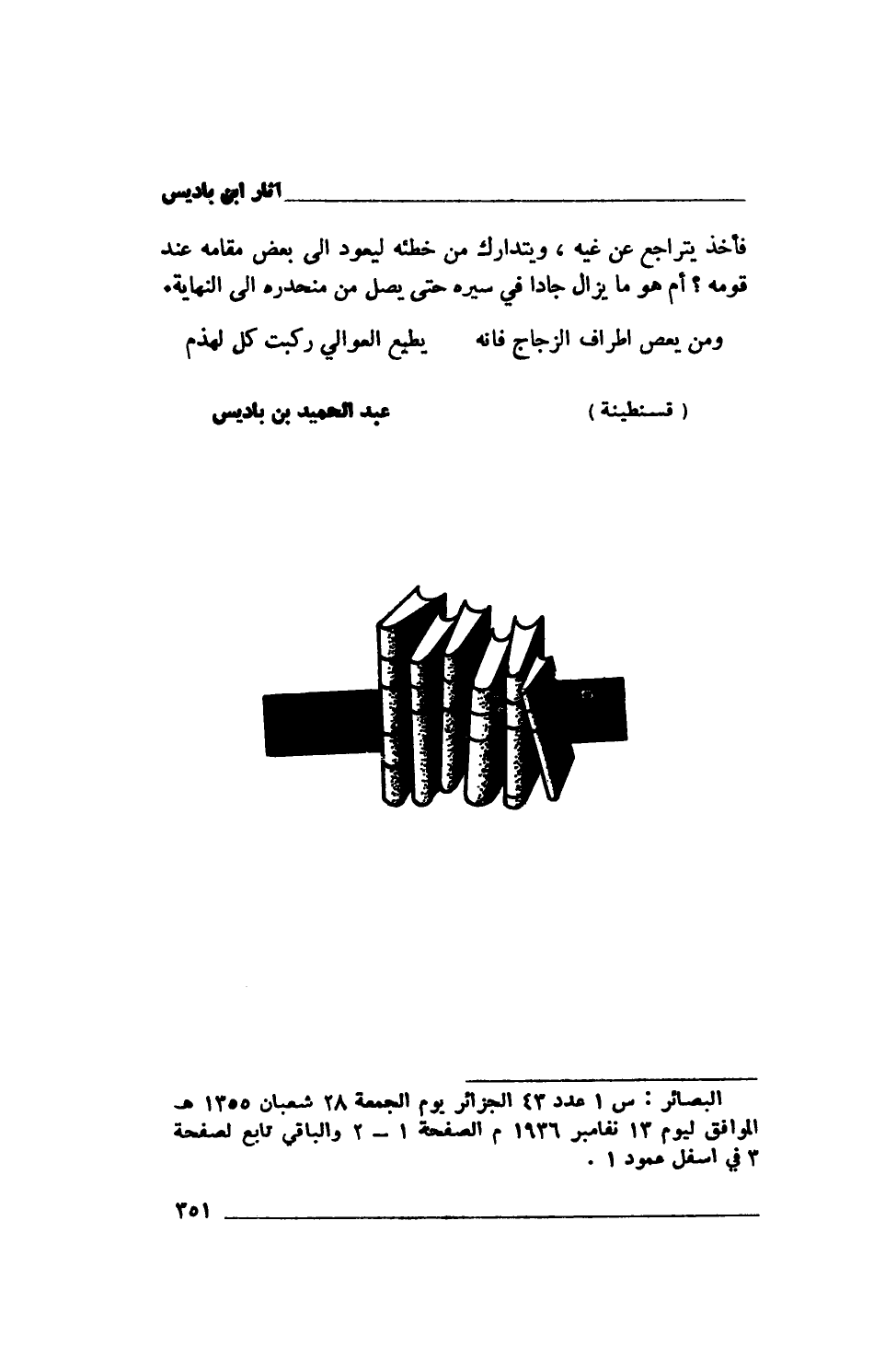 البصائر: س 1 عدد 43 الجزائر يوم الجمعة 28 شعبان 1305هـ الموافق ليوم 13 نفامبر 1936م الصفحه 1 - 2 والباقي تابع لصفحة 3 في أسفل عمود 1.