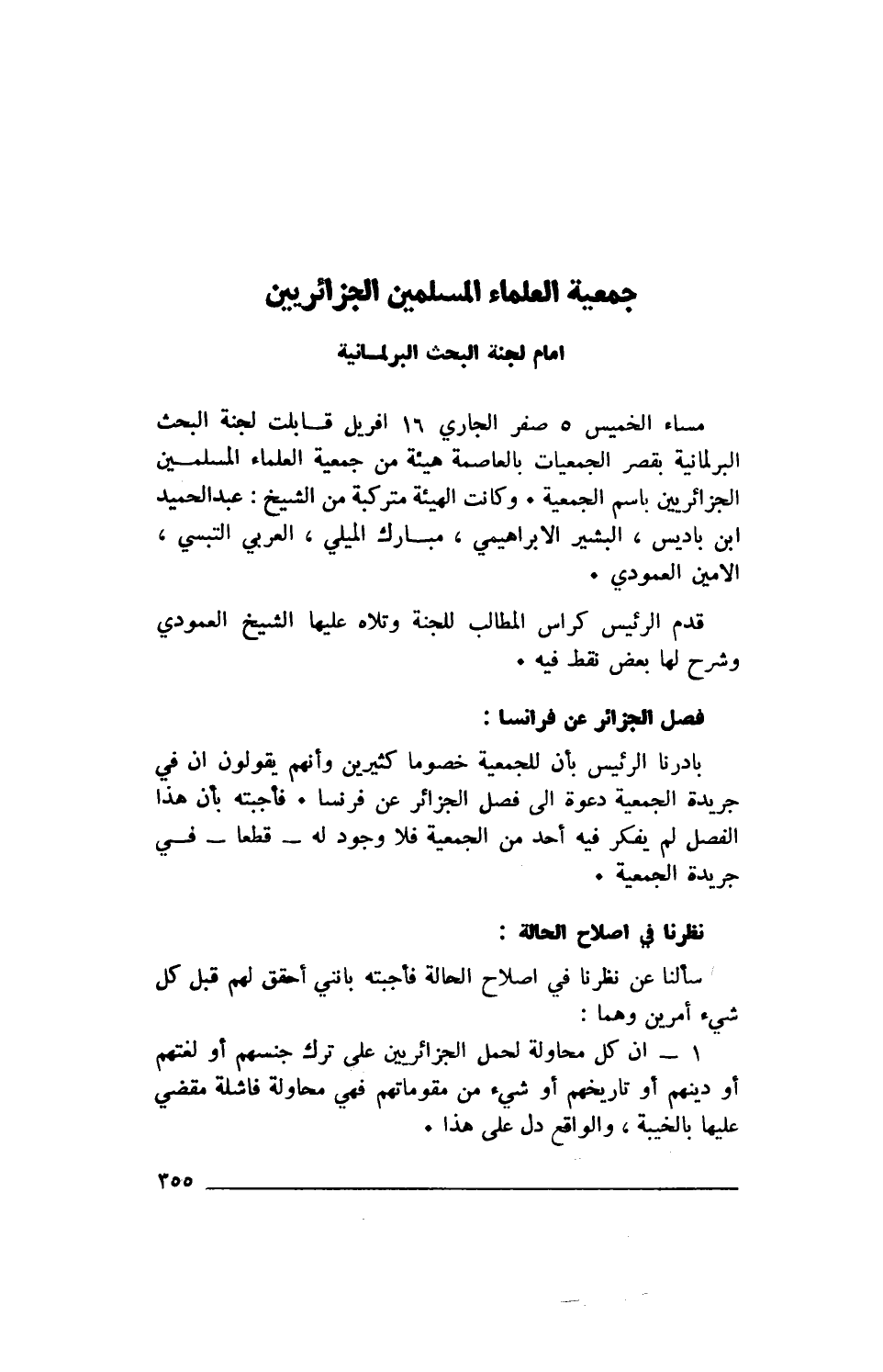 بادرنا الرئيس بأن للجمعية خصوما كثيرين وأنهم يقولون أن في جريدة الجمعية دعوة إلى فصل الجزائر عن فرنسا. فأجبته بأن هذا الفصل لم يفكر فيه أحد من الجمعية فلا وجود له- قطعا- في جريدة الجمعية.