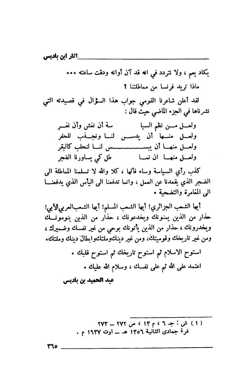 (1) ش: ج 6، م 13، ص 272 - 273 غرة جمادى الثانية 1356ه - أوت 1937م.
