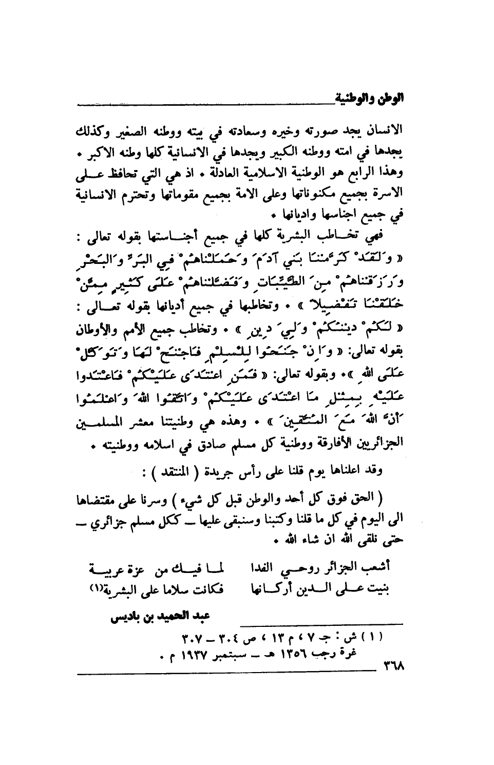 فهي تخاطب البشرية كلها في جميع أجناسها بقوله تعالى: {وَلَقَدْ كَرَّمْنَا بَنِي آدَمَ وَحَمَلْنَاهُمْ فِي الْبَرِّ وَالْبَحْرِ وَرَزَقْنَاهُمْ مِنَ الطَّيِّبَاتِ وَفَضَّلْنَاهُمْ عَلَى كَثِيرٍ مِمَّنْ خَلَقْنَا تَفْضِيلًا}. وتخاطبها في جميع أديانها بقوله تعالى: {لَكُمْ دِينُكُمْ وَلِيَ دِينِ}. وتخاطب جميع الأمم والأوطان بقوله تعالى: {وَإِنْ جَنَحُوا لِلسَّلْمِ فَاجْنَحْ لَهَا وَتَوَكَّلْ عَلَى اللَّهِ}. وبقوله تعالى: {فَمَنِ اعْتَدَى عَلَيْكُمْ فَاعْتَدُوا عَلَيْهِ بِمِثْلِ مَا اعْتَدَى عَلَيْكُمْ وَاتَّقُوا اللَّهَ وَاعْلَمُوا أَنَّ اللَّهَ مَعَ الْمُتَّقِينَ}. وهذه هي وطنيتنا معشر المسلمين الجزائريين الأفارقة ووطنية كل مسلم صادق في إسلامه ووطنيته. وقد أعلناها يوم قلنا على رأس جريدة (المنتقد): (الحق فوق كل أحد والوطن قبل كل شيء) وسرنا على مقتضاها إلى اليوم في كل ما قلنا وكتبنا وسنبقى عليها- ككل مسلم جزائري- حتى نلقى الله إن شاء الله.