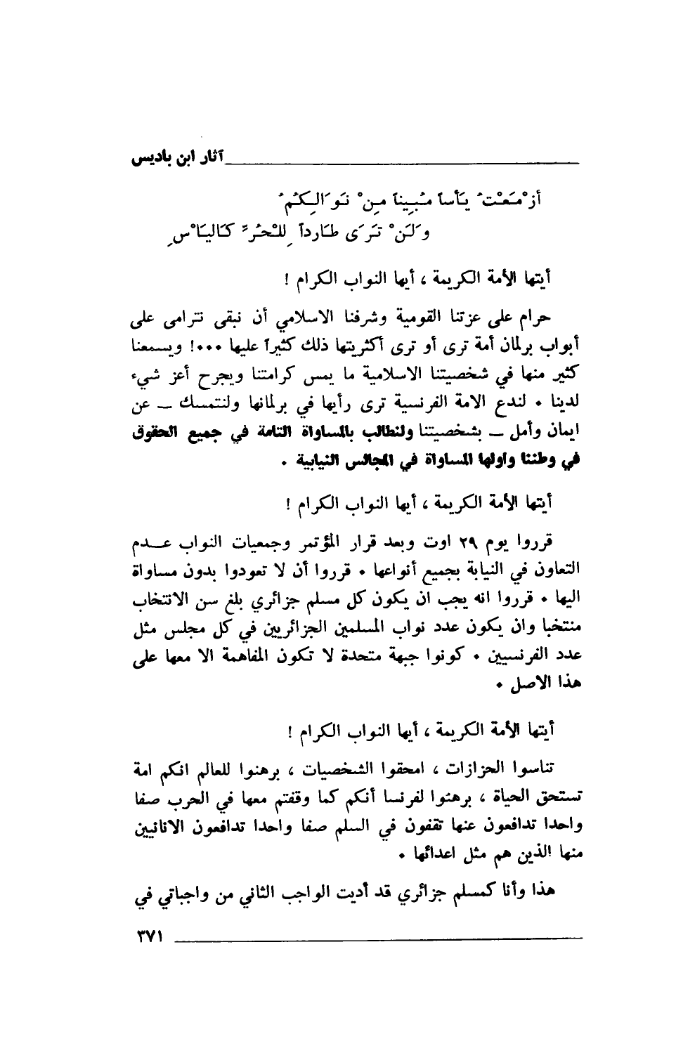 حرام على عزتنا القومية وشرفنا الإسلامي أن نبقى نترامى على أبواب برلمان أمة ترى أو ترى أكثريتها ذلك كثيراً عليها …! ويسمعنا كثير منها في شخصيتنا الإسلامية ما يمس كرامتنا ويجرح أعز شيء لدينا. لندع الأمة الفرنسية ترى رأيها في برلمانها ولنتمسك- عن إيمان وأمل- بشخصيتنا ولنطلب بالمساواة التامة في جميع الحقوق في وطننا وأولها المساواة في المجالس النيابية.