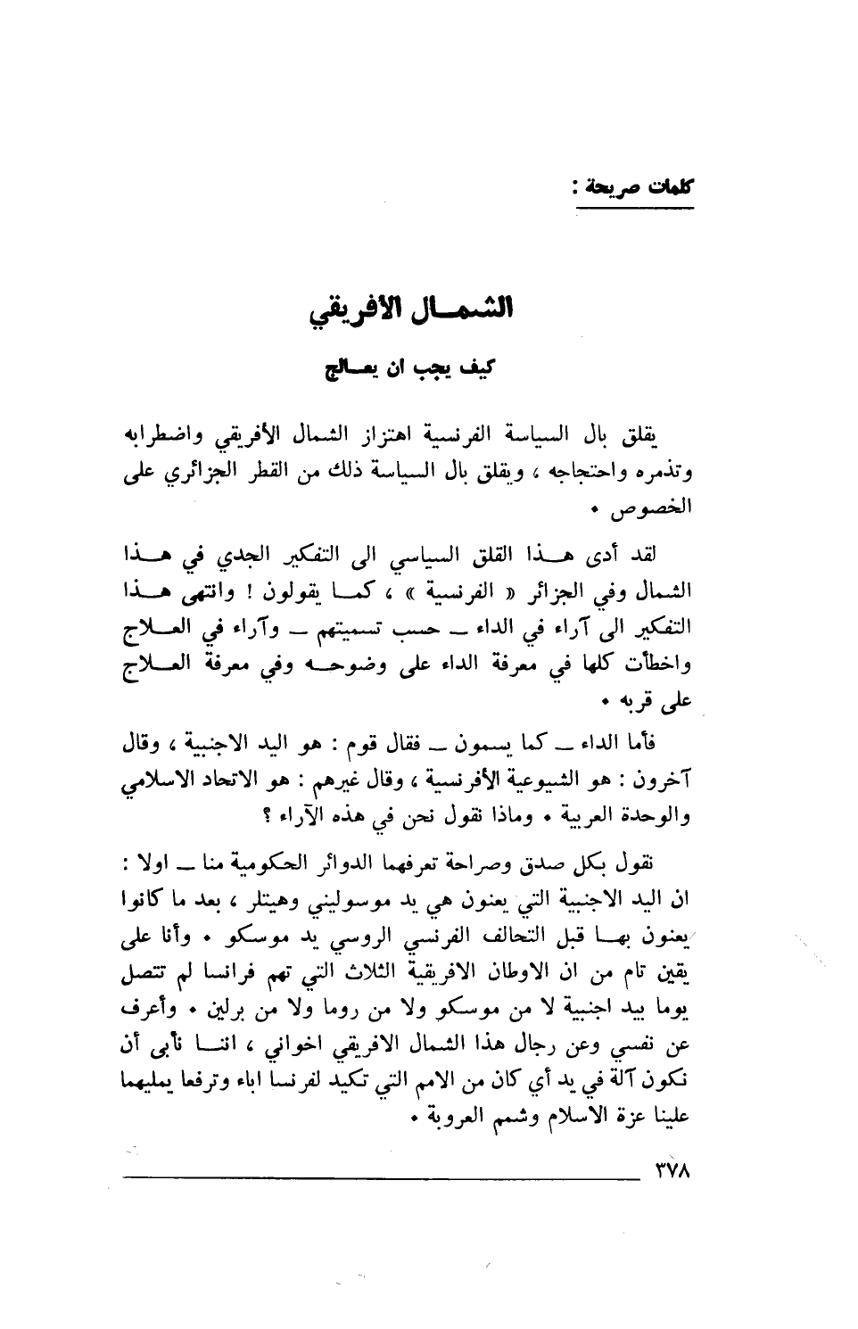 نقول بكل صدق وصراحة تعرفهما الدوائر الحكومية منا- أولا: إن اليد الأجنبية التي يعنون هي يد موسوليني وهيتلر، بعد ما كانوا يعنون بها قبل التحالف الفرنسي الروسي يد موسكو. وأنا على يقين تام من أن الأوطان الافريقية الثلاث التي تهم فرانسا لم تتصل يوما بيد أجنبية لا من موسكو ولا من روما ولا من برلين. وأعرف عن نفسي وعن رجال هذا الشمال الافريقي إخواني، إننا نأبى أن نكون آلة في يد أي كان من الأمم التي تكيد لفرنسا اباء وترفعا يمليهما علينا عزة الإسلام وشمم العروبة.