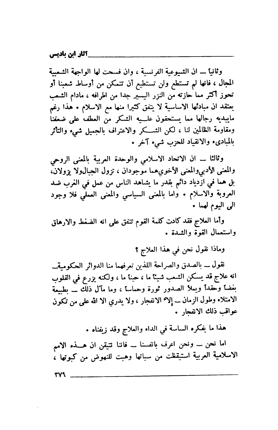 وثانيا- أن الشيوعية الفرنسية، وإن فسحت لها الواجهة الشعبية المجال، فإنها لم تستطع ولن تستطيع أن تتمكن من أوساط شعبنا أو تحوز أكثر مما حازته من النزر اليسير جدا من أطرافه، ما دام الشعب يعتقد أن مبادئها الأساسية لا يتفق كثيرا منها مع الإسلام. هذا رغم ما يبديه رجالها مما يستحقون عليه الشكر من العطف على ضعفنا ومقاومة الظالمين لنا، لكن الشكر والاعتراف بالجميل شيء والتأثر بالمبادئ والانقياد للحزب شيء آخر.