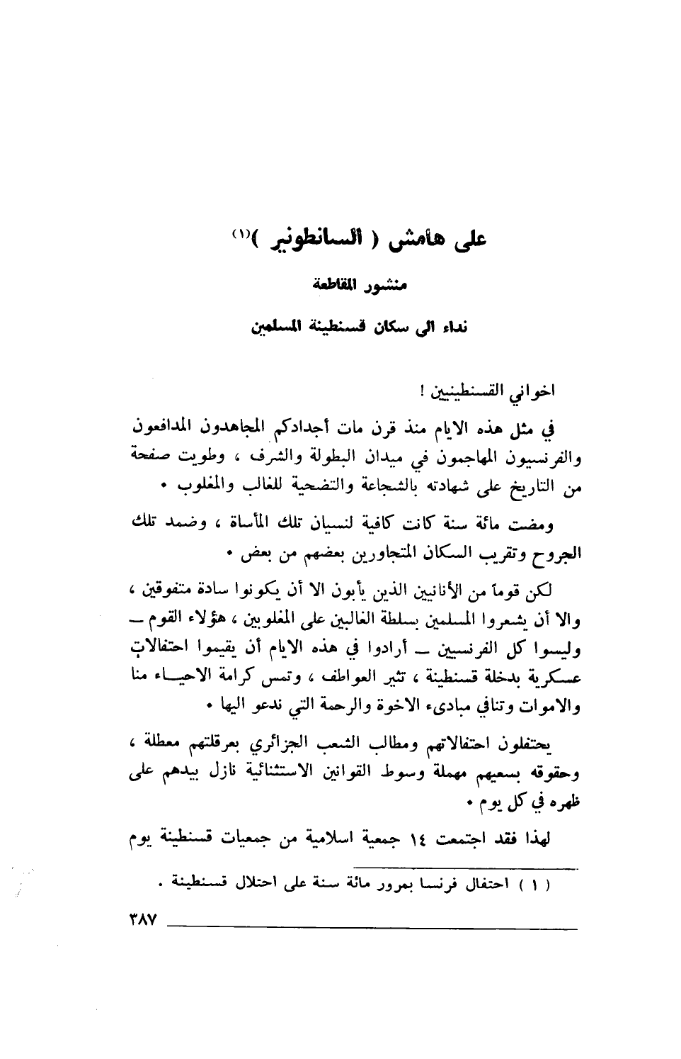لكن قوما من الأنانيين الذين يأبون إلا أن يكونوا سادة متفوقين، وإلا أن يشعروا المسلمين بسلطة الغالبين على المغلوبين، هؤلاء القوم- وليسوا كل الفرنسيين- أرادوا في هذه الأيام أن يقيموا احتفالات عسكرية بدخلة قسنطينة، تثير العواطف، وتمس كرامة الأحياء منا والأموات وتنافي مبادئ الأخوة والرحمة التي ندعو إليها.