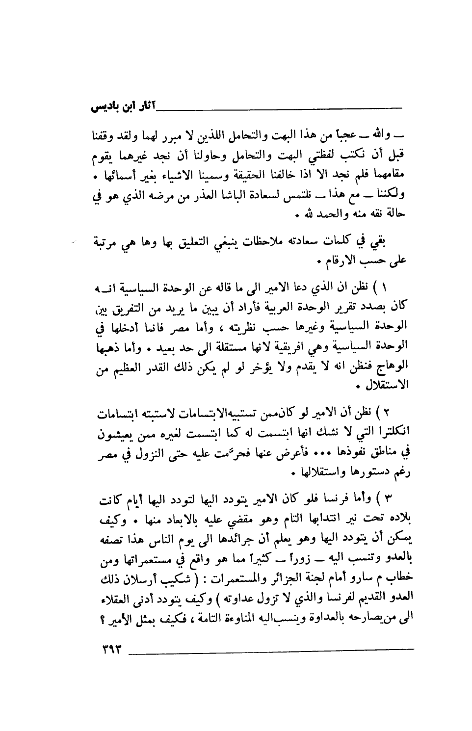 1) نظن ان الذي دعا الأمير إلى ما قاله عن الوحدة السياسية أنه كان بصدد تقرير الوحدة العربية فأراد أن يبين ما يريد من التفريق بين الوحدة السياسية وغيرها حسب نظريته، وأما مصر فإنما أدخلها في الوحدة السياسية وهي إفريقية لأنها مستقلة إلى حد بعيد. وأما ذهبها الوهاج فنظن أنه لا يقدم ولا يؤخر لو لم يكن ذلك القدر العظيم من الاستقلال.