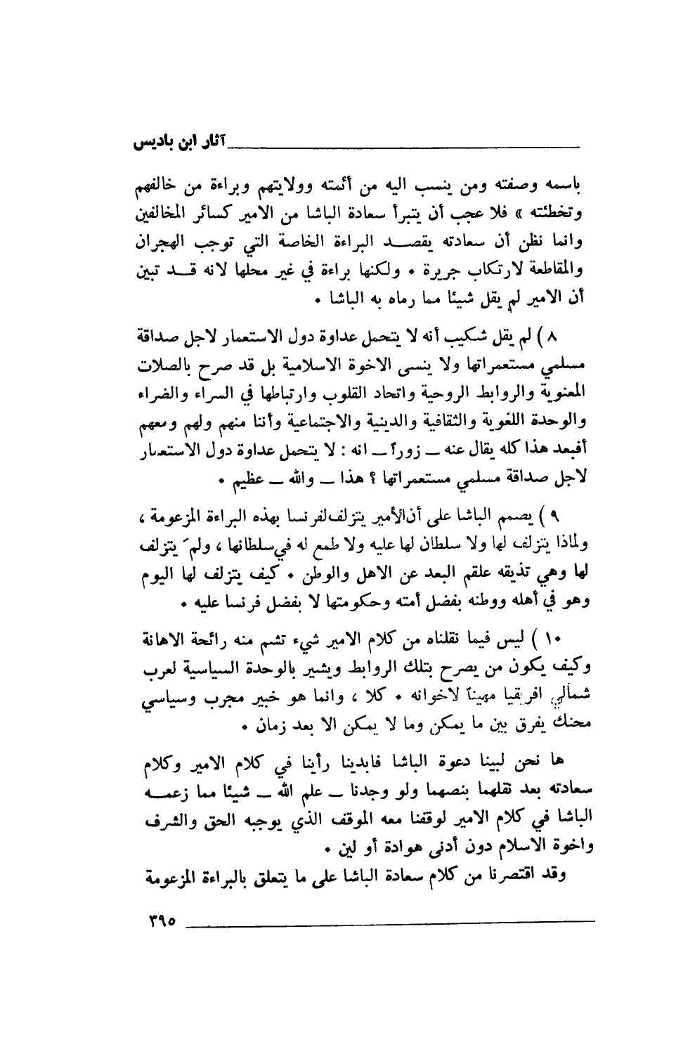 باسمه وصفته ومن ينسب إليه من أئمته وولايتهم وبراءة من خالفهم وتخطئته" فلا عجب أن يتبرأ سعادة الباشا من الأمير كسائر المخالفين وإنما نظن أن سعادته يقصد البراءة الخاصة التي توجب الهجران والمقاطعة لارتكاب جريرة. ولكنها براءة في غير محلها لأنه قد تبين أن الأمير لم يقل شيئا مما رماه به الباشا.