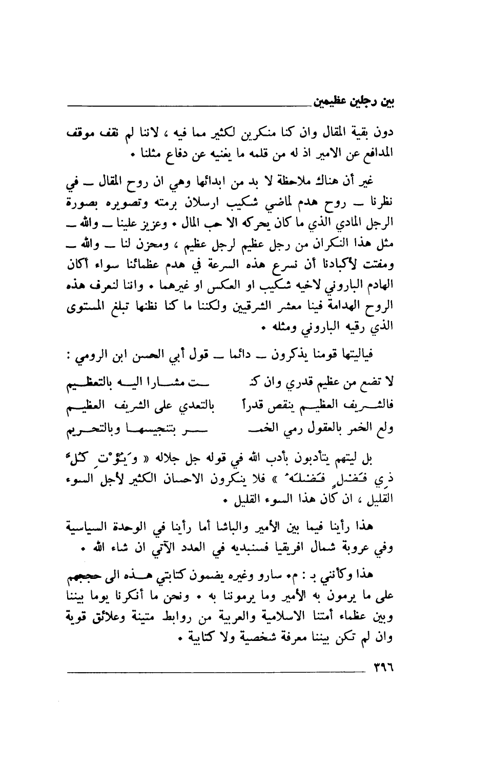 دون بقية المقال وإن كنا منكرين لكثير مما فيه، لاأننا لم نقف موقف المدافع عن الأمير إذ له من قلمه ما يغنيه عن دفاع مثلنا.