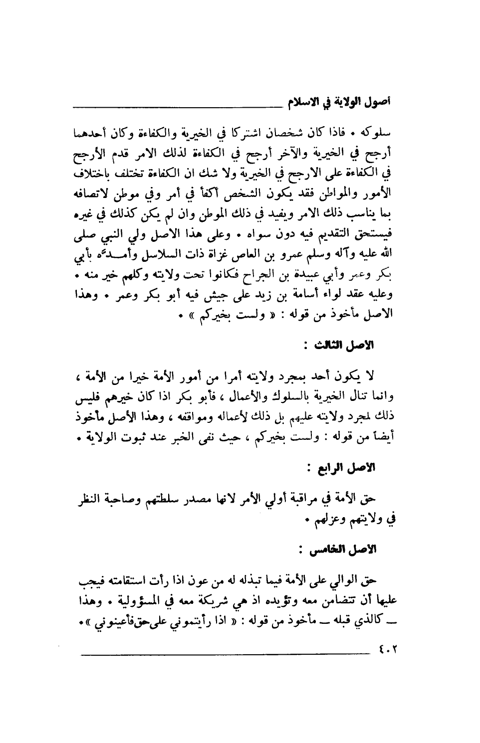 سلوكه. فإذا كان شخصان اشتركا في الخيرية والكفاءة وكان أحدهما أرجح في الخيرية والآخر أرجح في الكفاءة لذلك الأمر قدم الأرجح في الكفاءة على الأرجح في الخيرية ولا شك أن الكفاءة تختلف باختلاف الأمور والمواطن فقد يكون الشخص أكفأ في أمر وفي موطن لاتصافه بما يناسب ذلك الأمر ويفيد في ذلك الموطن وإن لم يكن كذلك في غيره فيستحق التقديم فيه دون سواه. وعلى هذا الأصل ولي النبي صلى الله عليه وآله وسلم عمرو بن العاص غزاة ذات السلاسل وأمدَّه بأبي بكر وعمر وأبي عبيدة بن الجراح فكانوا تحت ولايته وكلهم خير منه. وعليه عقد لواء أسامة بن زيد على جيش فيه أبو باكر وعمر. وهذا الأصل مأخوذ من قوله: "ولست بخيركم".