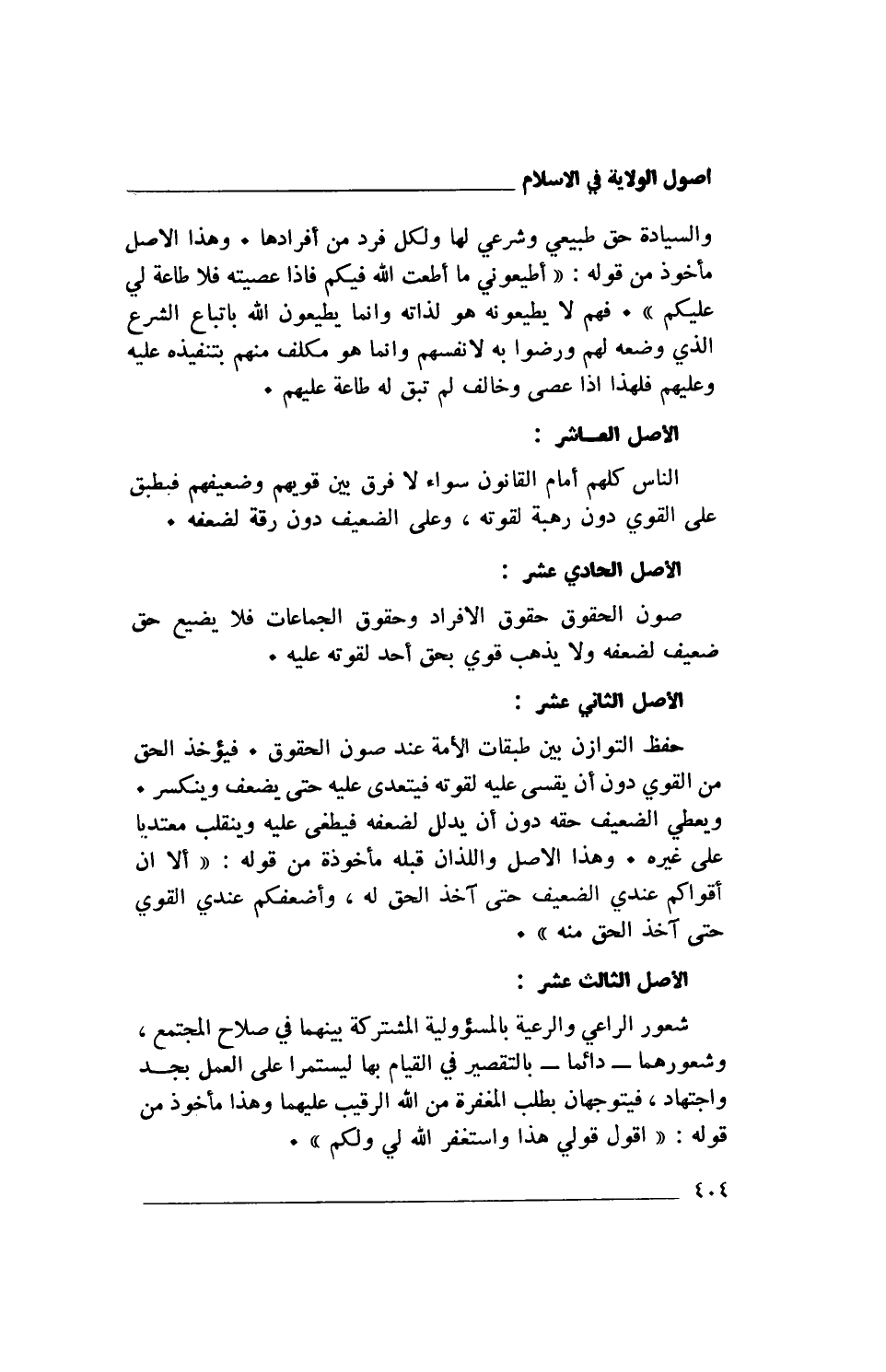 والسيادة حق طبيعي وشرعي لها ولكل فرد من أفرادها. وهذا الأصل مأخوذ من قوله: "أطيعوني ما أطعت الله فيكم فإذا عصيته فلا طاعة لي عليكم". فهم لا يطيعونه هو لذاته وإنما يطيعون الله باتباع الشرع الذي وضعه لهم ورضوا به لأنفسهم وإنما هو مكلف منهم بتنفيذه عليه وعليهم فلهذا إذا عصى وخالف لم تبق له طاعة عليهم.