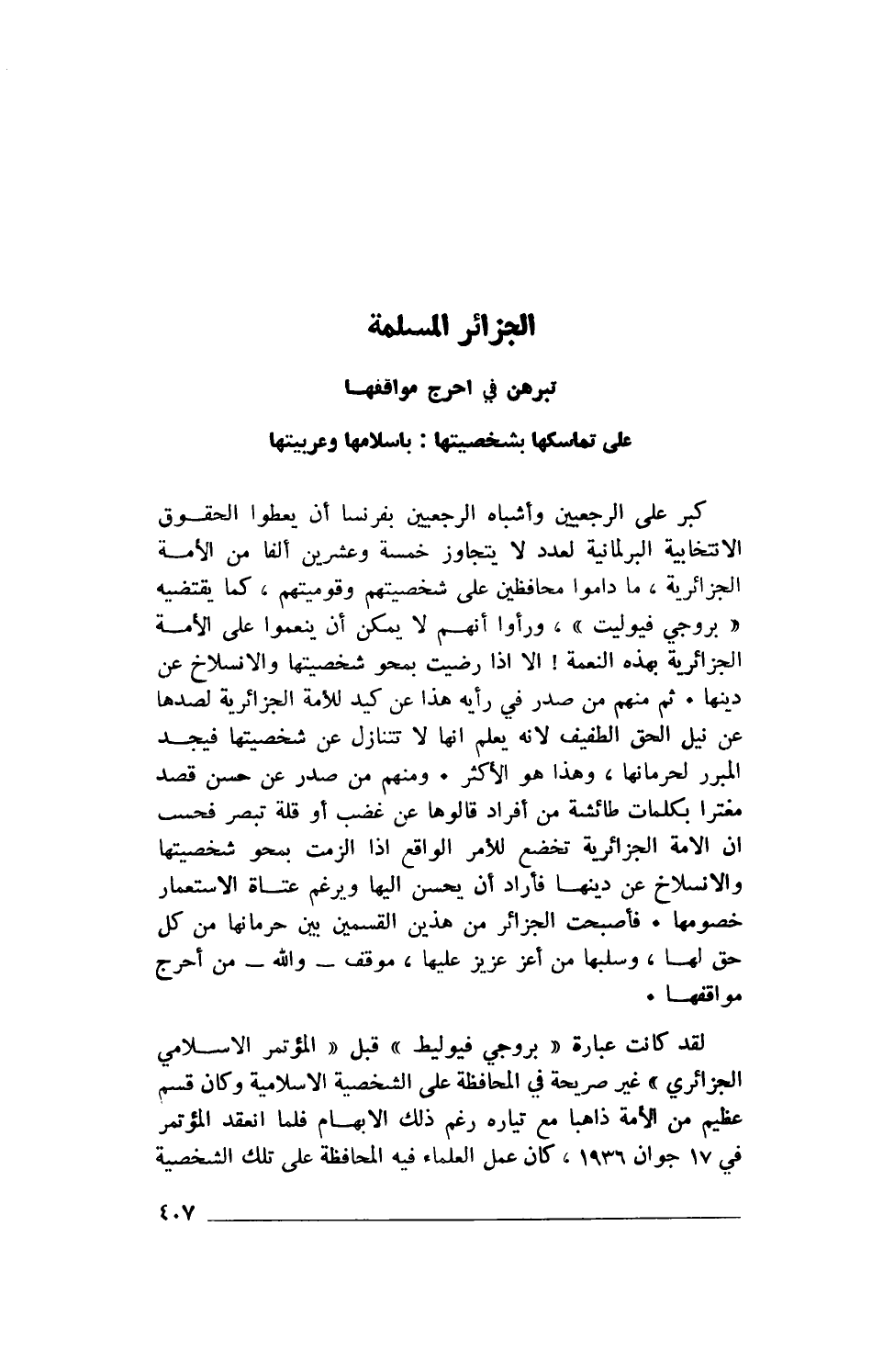 كبر على الرجعيين وأشباه الرجعيين بفرنسا أن يعطوا الحقوق الانتخابية البرلمانية لعدد لا يتجاوز خمسة وعشرين ألفا من الأمة الجزائرية، ما داموا محافظين على شخصيتهم وقوميتهم، كما يقتضيه "بروجي فيوليت"، ورأوا أنهم لا يمكن أن ينعموا على الأمة الجزائرية بذه النعمة! إلا إذا رضيت بمحو شخصيتها والانسلاخ عن دينها. ثم منهم من صدر في رأيه هذا عن كيد للأمة الجزائرية لصدها عن نيل الحق الطفيف لأنه يعلم أنها لا تتنازل عن شخصيتها فيجد المبرر لحرمانها، وهذا هو الأكثر. ومنهم من صدر عن حسن قصد مغترا بكلمات طائشة من أفراد قالوها عن غضب أو قلة تبصر فحسب أن الأمة الجزائرية تخضع للأمر الواقع إذا ألزمت بمحو شخصيتها والانسلاخ عن دينها فأراد أن يحسن إليها ويرغم عتاة الاستعمار خصومها. فأصبحت الجزائر من هذين القسمين بين حرمانها من كل حق لها، وسلبها من أعز عزيز عليها، موقف- والله- من أحرج مواقفها.