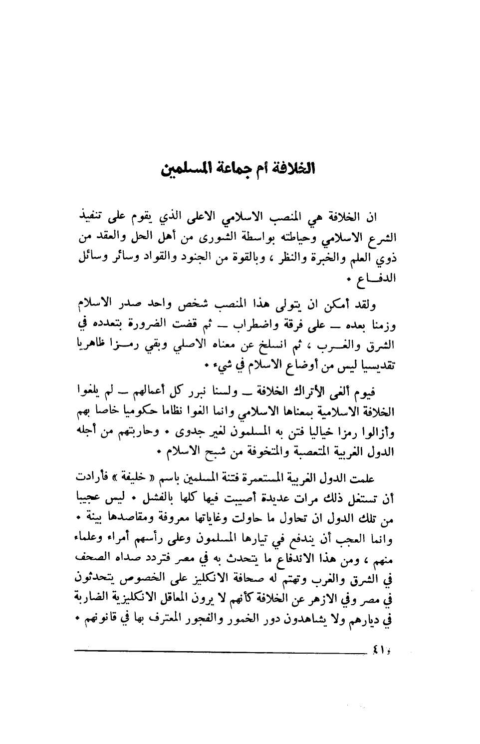 علمت الدول الغربية المستعمرة فتنة المسلمين باسم "خليفة" فأرادت أن تستغل ذلك مرات عديدة أصيبت فيها كلها بالفشل. ليس عجيبا من تلك الدول أن تحاول ما حاولت وغاياتها معروفة ومقاصدها بينة. وإنما العجب أن يندفع في تيارها المسلمون وعلى رأسهم أمراء وعلماء منهم، ومن هذا الاندفاع ما يتحدث به في مصر فتردد صداه الصحف في الشرق والغرب وتهتم له صحافة الانكليز على الخصوص يتحدثون في مصر وفي الأزهر عن الخلافة كأنهم لا يرون المعاقل الانكليزية الضاربة في ديارهم ولا يشاهدون دور الخمور والفجور المعترف بها في قانونهم.