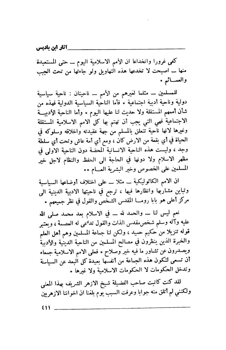 عليه وآله وسلم شخص مقدس الذات والقول تدَّعى له العصمة، ويعتبر قوله تنزيلا من حكيم حميد، ولكن لنا جماعة المسلمين وهم أهل العلم والخبرة الذين ينظرون في مصالح المسلمين من الناحية الدينية والأدبية ويصدرون عن تشاور ما فيه خير وصلاح. فعلى الأمم الإسلاميه جمعاء أن تسعى لتكون هذه الجماعة من أنفسها بعيدة كل البعد عن السياسة وتدخل الحكومات لا الحكومات الإسلامية ولا غيرها.