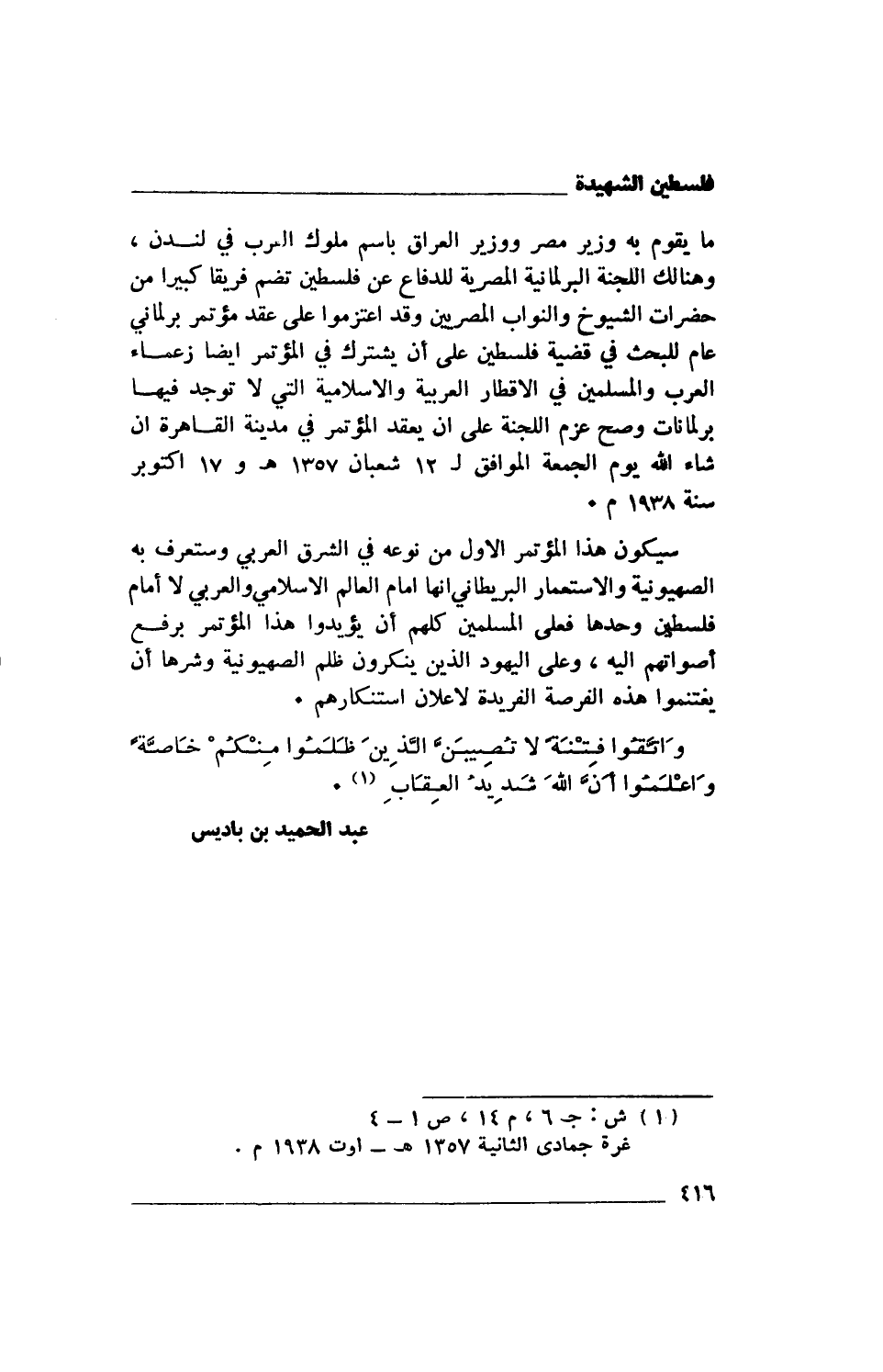 (1) ش: ج 6، م 14، ص 1 - 4 غرة جمادى الثانية 1357هـ- أوت 1938م.