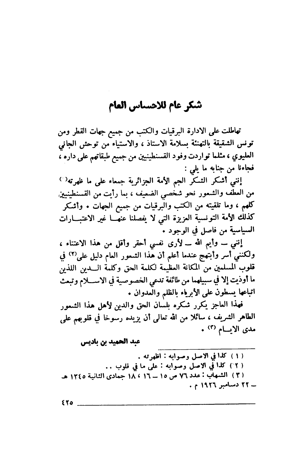 إنني أشكر الشكر الجم الأمة الجزائرية جمعاء على ما ظهرته (1) من العطف والشعور نحو شخصي الضعيف، بما رأيت من القسنطينيين كلهم، وما تلقيته من الكتب والبرقيات من جميع الجهات. وأشكر كذلك الأمة التونسية العزيزة التي لا يفصلنا عنها غير الاعتبارات السياسية من فاصل في الوجود.