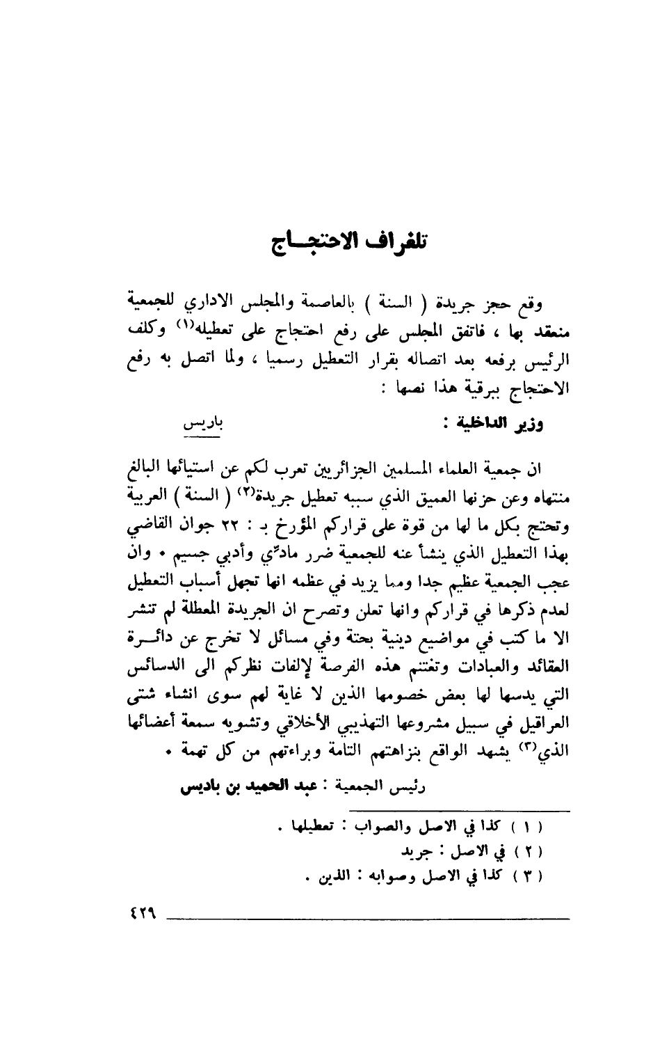 إنّ جمعية العلماء المسلمين الجزائريين تعرب لكم عن استيائها البالغ منتهاه وعن حزنها العميق الذي سببه تعطيل جريدة (2) (السنة) العربية وتحتج بكل ما لها من قوة على قراركم الؤرخ بـ: 22 جوان القاضي بهذا التعطيل الذي ينشأ عنه للجمعية ضرر مادي وأدبي جسيم. وإن عجب الجمعية عظيم جدا ومما يزيد في عظمه أنها تجهل أسباب التعطيل لعدم ذكرها في قراركم وأنها تعلن وتصرح أن الجريدة المعطلة لم تنشر إلا ما كتب في مواضيع دينية بحتة وفي مسائل لا تخرج عن دائرة العقائد والعبادات وتغتنم هذه الفرصة لإلفات نظركم إلى الدسائس التي يدسها لها بعض خصومها الذين لا غاية لهم سوى إنشاء شتى العراقيل في سبيل مشروعها التهذيبي الأخلاقي وتشويه سمعة أعضائها الذي (3) يشهد الواقع بنزاهتهم التامة وبراءتهم من كل تهمة.