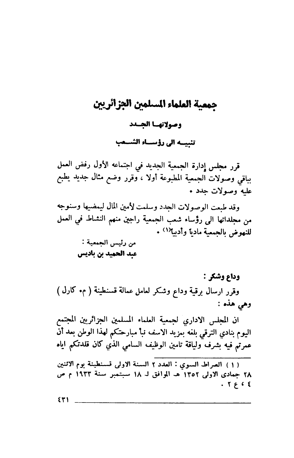 (1) الصراط السوي: العدد 2 السنة الأولى قسنطينة يوم الاثنين 28 جمادى الأولى 1352هـ الموافق لـ 18 سبتمبر سنة 1933م ص 4، ع 2.