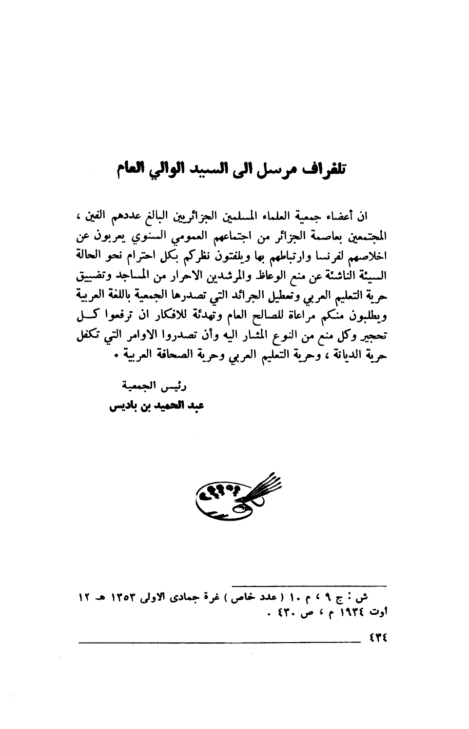 إن أعضاء جمعية العلماء المسلمين الجزائريين البالغ عددهم ألفين، المجتمعين بعاصمة الجزائر من اجتماعهم العمومي السنوي يعربون عن إخلاصم لفرنسا وارتباطهم بها ويلفتون نظركم بكل احترام نحو الحالة السيئة الناشئة عن منع الوعاظ والمرشدين الأحرار من المساجد وتضييق حرية التعليم العربي وتعطيل الجرائد التي تصدرها الجمعية باللغة العربية ويطلبون منكم مراعاة للصالح العام وتهدئة للأفكار أن ترفعوا كل تحجير وكل منع من النوع المشار إليه وأن تصدروا الأوامر التي تكفل حرية الديانة، وحرية التعليم العربي وحرية الصحافة العربية.