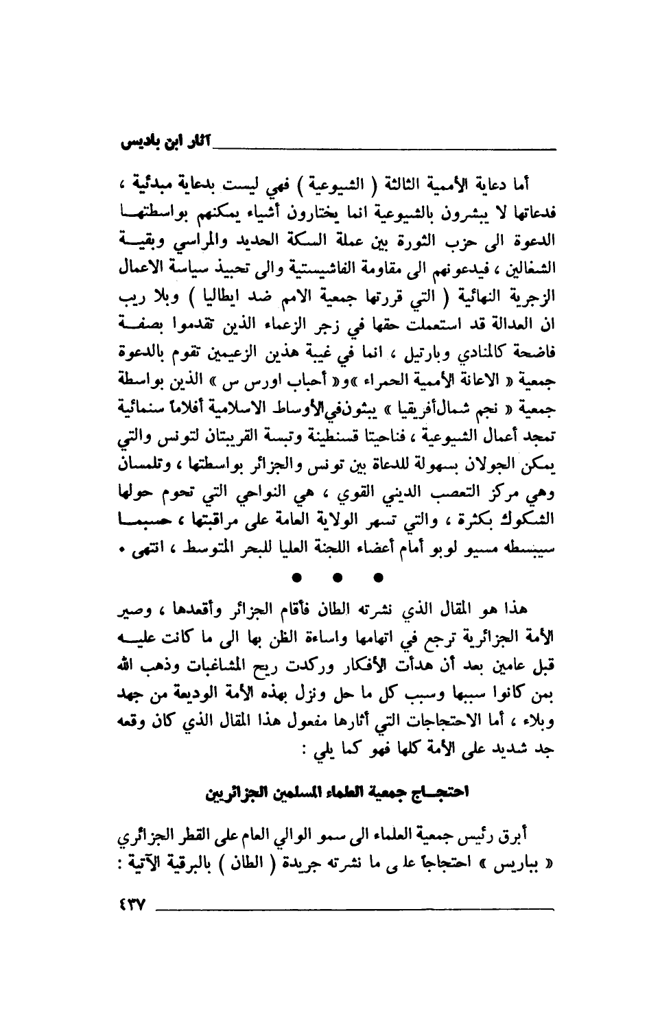 أبرق رئيس جمعية العلماء إلى سمو الوالي العام على القطر الجزائري "بباريس" إحتجاجا على ما نشرته جريدة (الطان) بالبرقية الآتية: