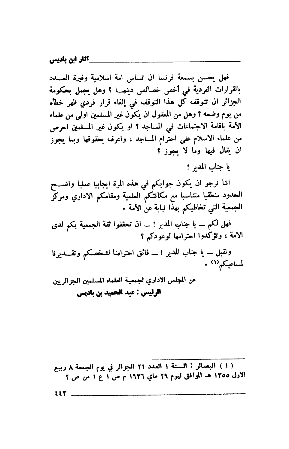 (1) البصائر: السنة 1 العدد 21 الجزائر في يوم الجمعة 8 ربيع الأول 1355هـ الموافق ليوم 29 ماي 1936م ص 1 ع 1 من ص 2.