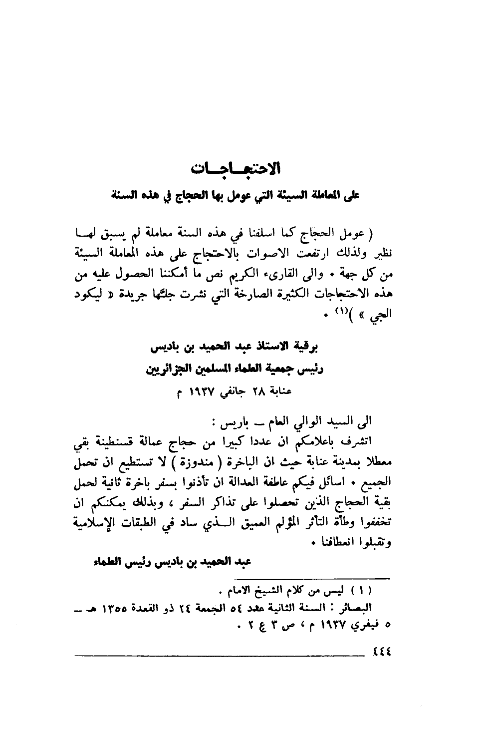 أتشرف بإعلامكم أن عددا كبيرا من حجاج عمالة قسنطينة بقي معطلا بمدينة عنابة حيث أن الباخرة (مندوزة) لا تستطيع أن تحمل الجميع. أسائل فيكم عاطفة العدالة أن تأذنوا بسفر باخرة ثانية لحمل بقية الحجاج الذين تحصلوا على تذاكر السفر، وبذلك يمكنكم أن تخففوا وطأة التأثر المؤلم العميق الذي ساد في الطبقات الإسلامية وتقبلوا انعطافنا.